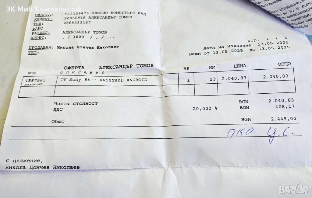 Закупен на 13.05.2025год.