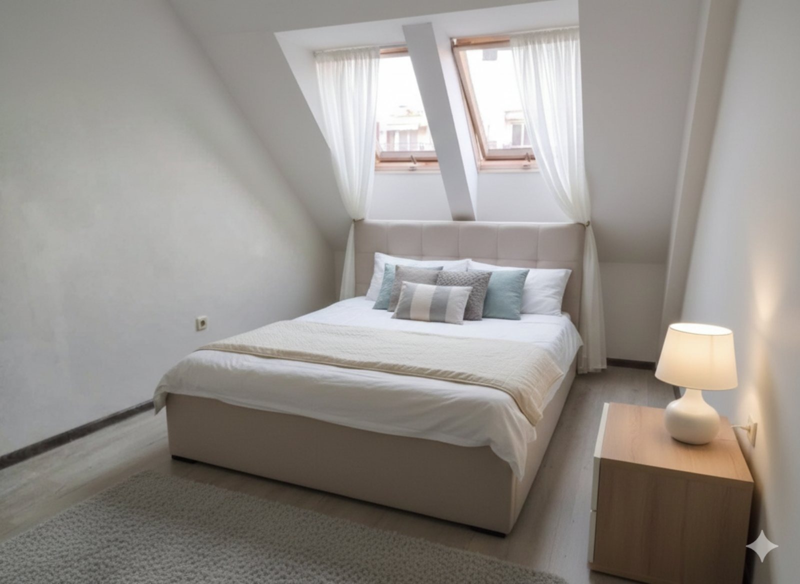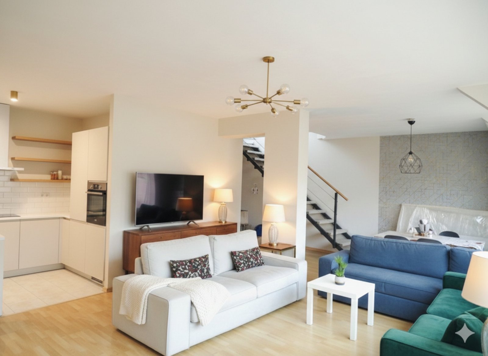 Разпределението на имота е: коридор, просторна всекидневна с кухненски бокс, три спални (едната с дрешник), две бани с тоалетни и две тераси, достъпни от хола. От дневната водят стълби към великолепна покривна тераса с размер 100 кв.м, предлагаща панорамна гледка и възможност за обособяване на зона за релакс или барбекю. Стълбите могат да бъдат демонтирани, като апартаментът остава напълно функционален на едно ниво.
