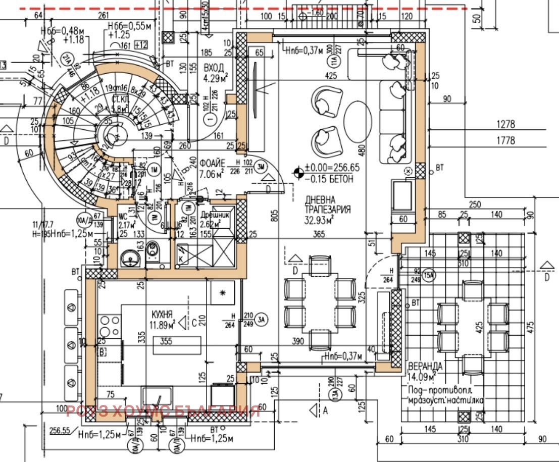 -1ниво - Всекидневна, трапезария, кухня, санитарен възел, дрешник/склад и веранда