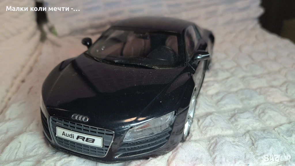 5..- металeн модел на Audi R8 - 2007 г. Мащаб 1:18 - ( 25 см . дължина ) . С велур в купето. Забележка - стъклото на предния ляв фар е правено допълнително. Производител Kyosho . Цена - 72 евро