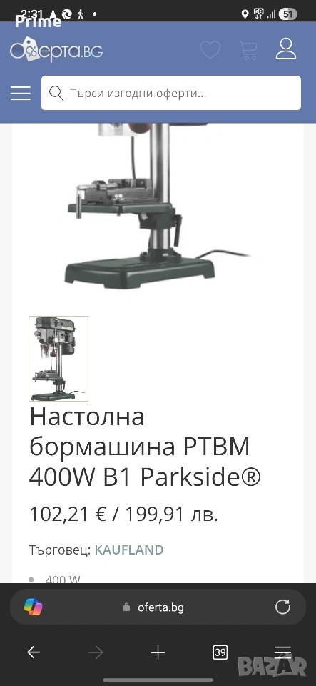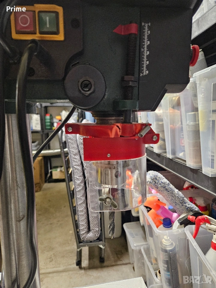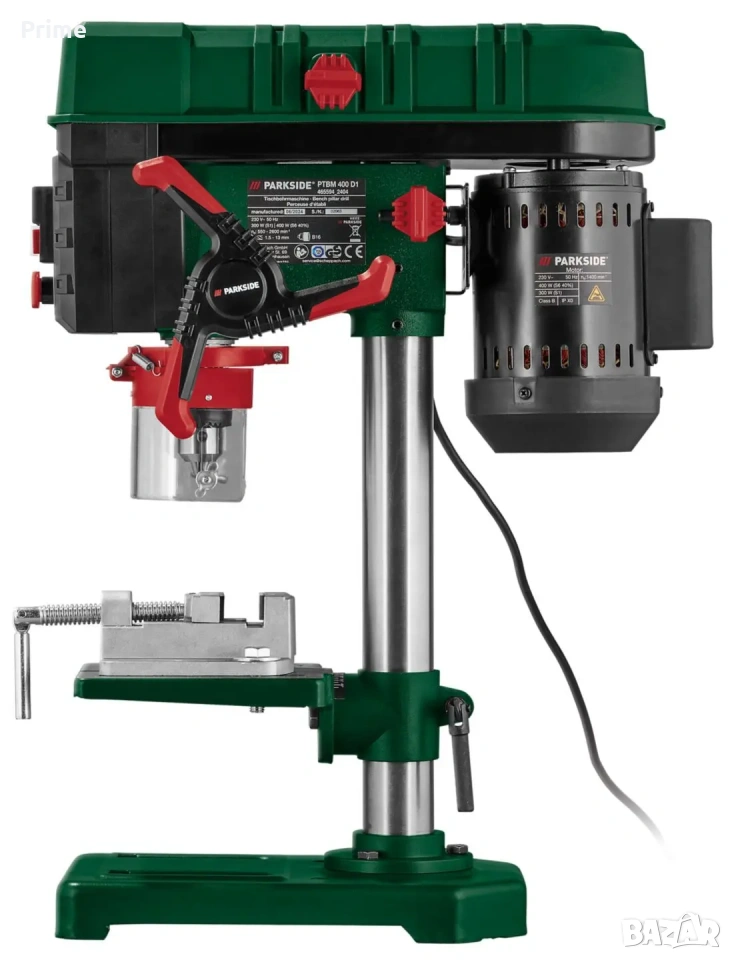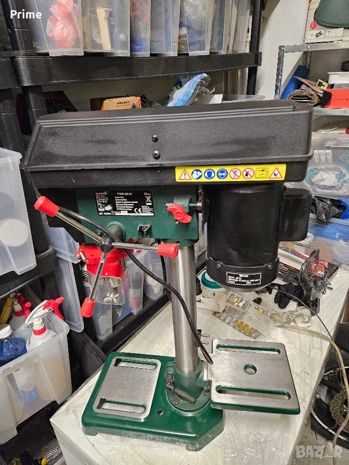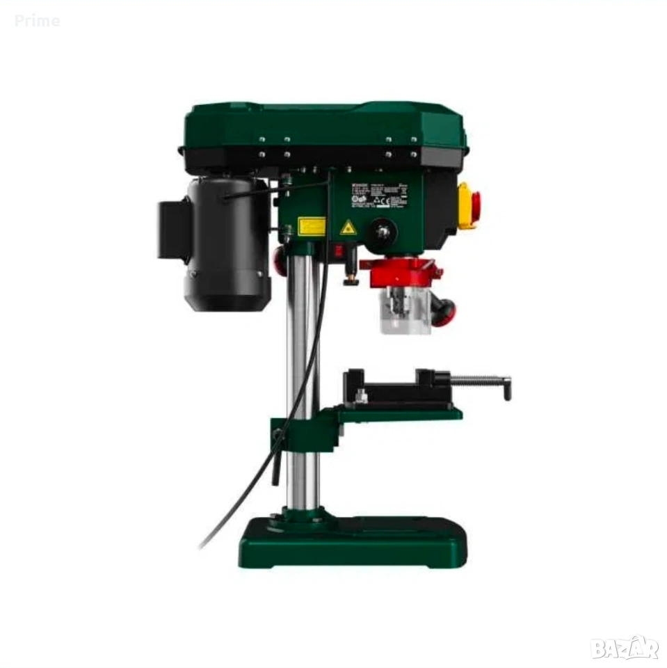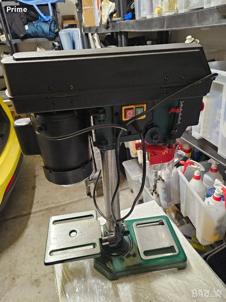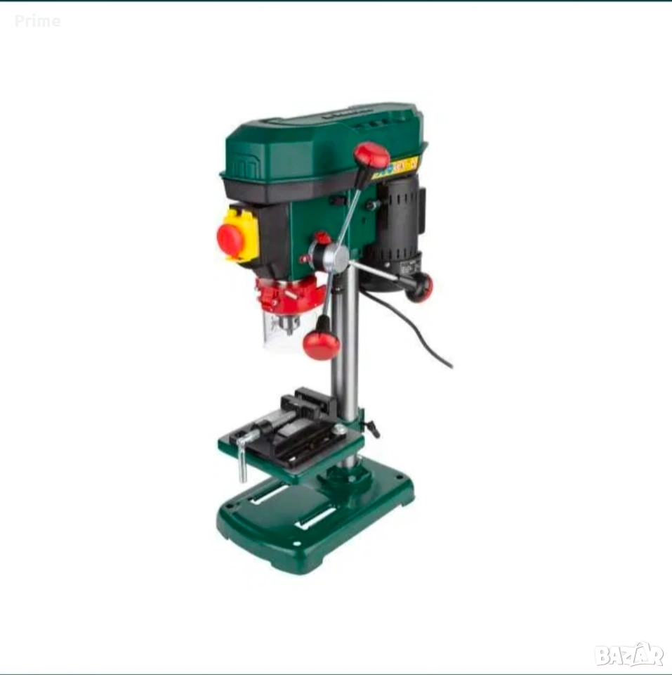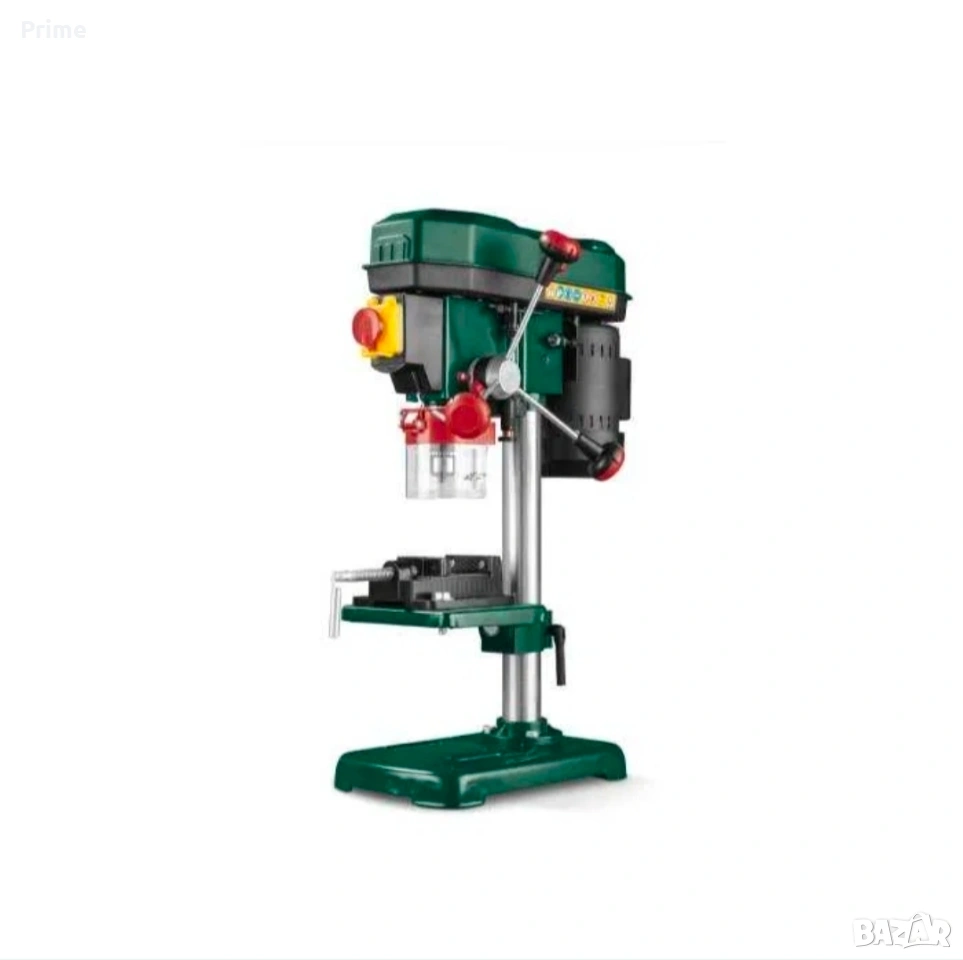 Машината е чисто нова и неизползвана. Цената е такава до края на седмицата. За прецизно пробиване в дърво, метал и пластмаса Безкрайно регулируема дълбочина на пробиване – вкл. Задвижване на колана с 5 регулируеми скорости на пробиване Регулируема на височина и под ъгъл сондажна маса от двете страни с градусова скала 2 лазера за свободно регулируема маркировка Регулируем порок Защитен превключвател за включване/изключване и челен авариен прекъсвач Стоманена стойка за монтаж на работната пейка Удобен лост за понижаване с пружинно заредена възвращаемост Траен индукционен мотор Висококачествена бормашина патронница – вкл. бормашина патронни ключ Сгъваема защита от чипове, изработена от прозрачен материал Безопасно изключване, когато корпусът за предаване е отворен Спецификации Аншлуслистунг: 400 W (S6 40 %) / 350 W (S1) Скорост: 600-2650 мин-̈ (5 етапа) Борхуб: 0–50 мм Патронница за бормашина: B16 (1,5–13 мм) Ъгъл на сондажната маса: -45° до +45° Нецкабеленге: 3 м диаметър на пробиване: 25 mm в дърво, 10 mm в стомана Материал Стомана, пластмаса Показатели Бортиш: 170 x 168 мм Стойка: 316 x 204 мм Височина: 640 мм Тегло ca. 13.320 гр