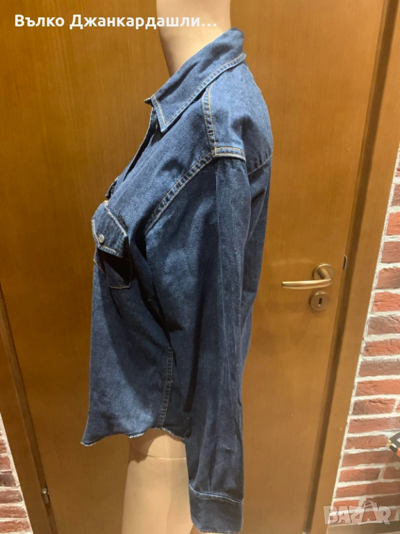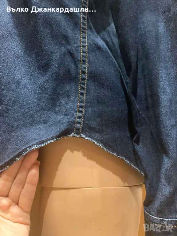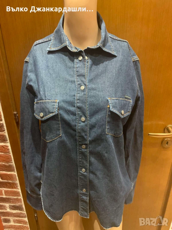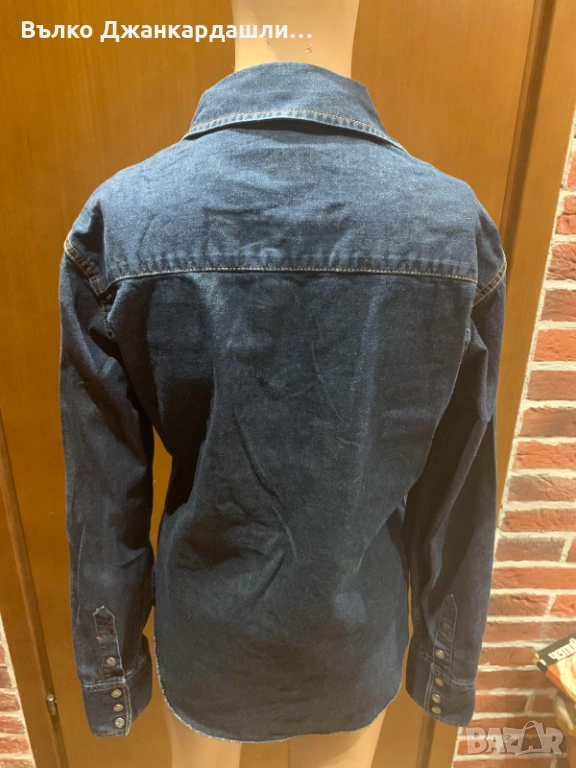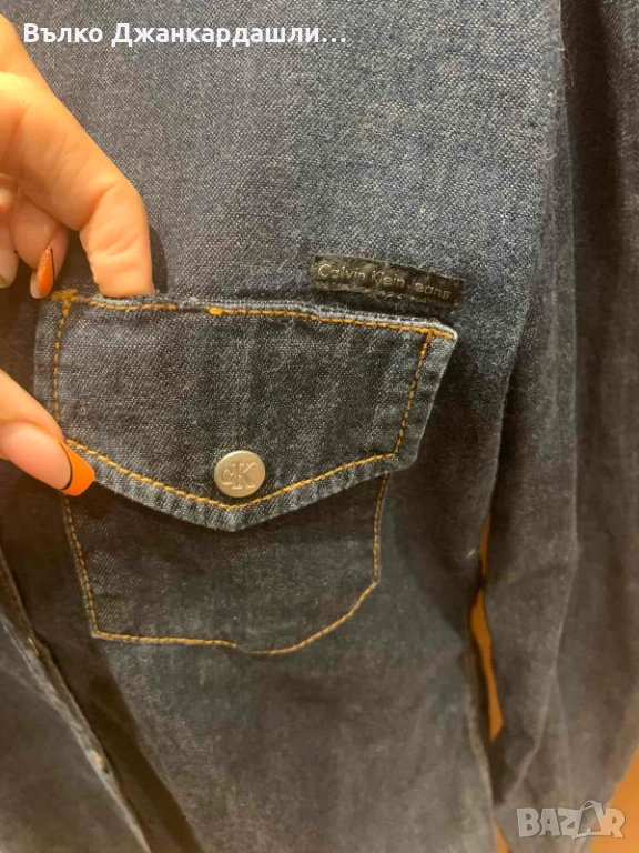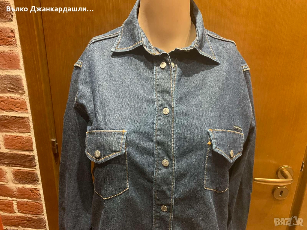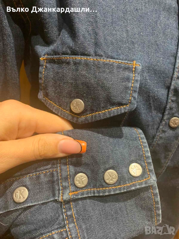 Calvin Klein Jeans. Денимът е тъмен и подходящ за по- хладните месеци. Универсална дреха, която може да се комбинира еднакво успешно като част от по- спортен или елегантен стил. В съчетание с пола, обувки на висок ток и красиво колие стои страхотно. С кецове и дънки става елемент от класическа спортна визия. Спокойно може да се нарече “must have” за всеки женски гардероб. Съставът е 100 % памук. Брандирани копчета тик- так навсякъде- по цялата дължина на закопчаването, на джобовете и в долната част на ръкавите. На лявото джобче има интересен детайл- малък отвор за слагане на химикал( на предпоследната снимка).
