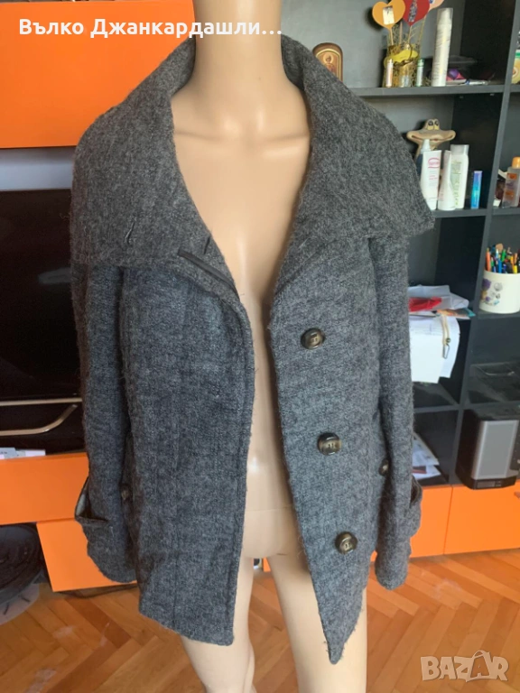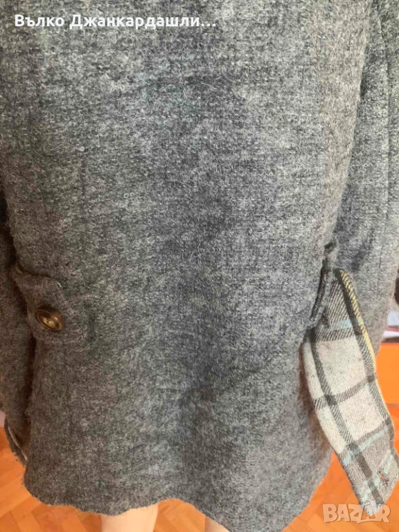 Късо палто на Weekend Max Mara в сиво. Интересни детайли. Възможност за високо закопчване чрез висока яка (снимка 1), която по желание може да не се закопчава догоре и да стои като на снимка 2. Скрито закопчаване. С допълнително платки на ръкавите при китките и на кръста. С брандирана подплата. Стои вталено,