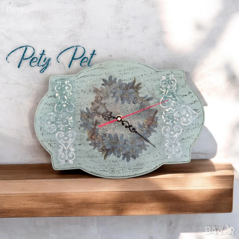 Стенен часовник с безвумен механизъм. Размер 32/22см. Декориран с декупаж.