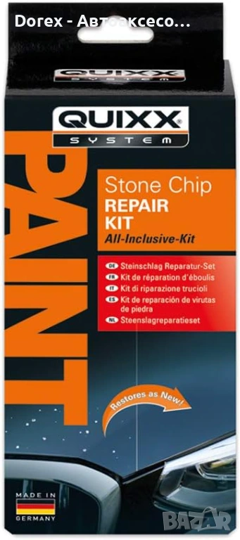 Комплектът QUIXX Stone Chip Repair Kit е специално създаден за бързо и ефективно заличаване на малки драскотини, пукнатини и следи от летящи камъни по предния капак, бронята или други повърхности на автомобила.
