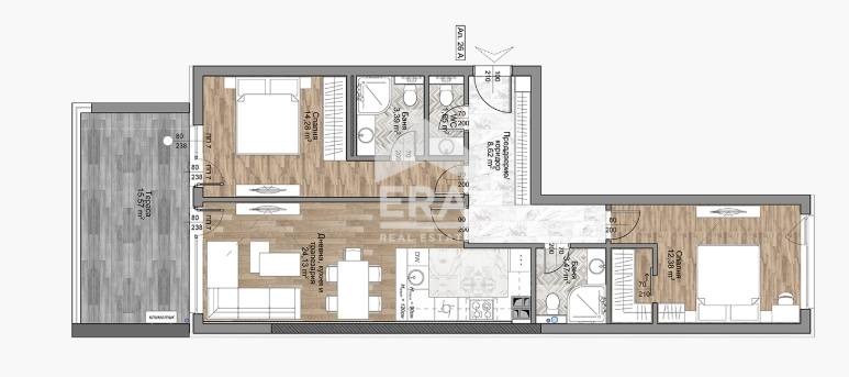 Сградата е от доказан инвеститор, изложението е юг - север, с акцент на просторна южна тераса. Функционалното разпределение с чиста площ от 82.89 кв.м. включва две спални и три санитарни възела.