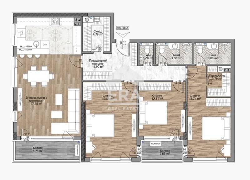 - Практично разпределение: три санитарни възела, склад и гардеробна.