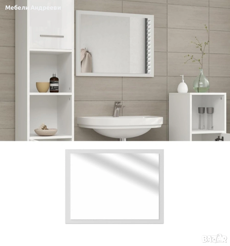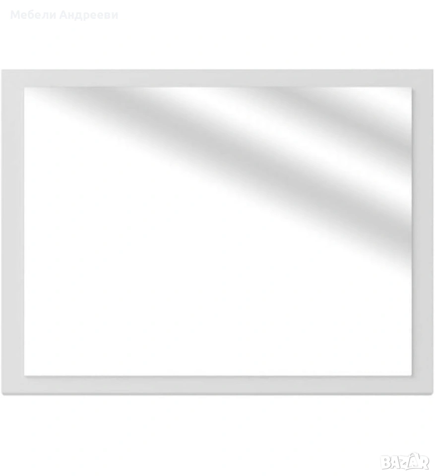 Огледалото е с минималистична права рамка в бял гланц, което му придава по-елегантен и чист вид. Стои добре във всяка модерна баня и визуално разширява пространството. Подходящо за монтаж над шкаф или мивка, като се поставя лесно и стабилно.