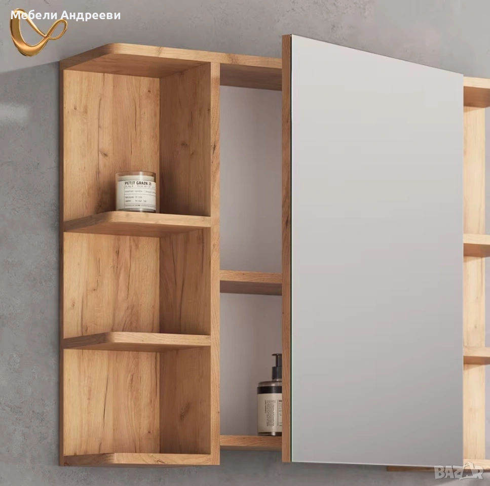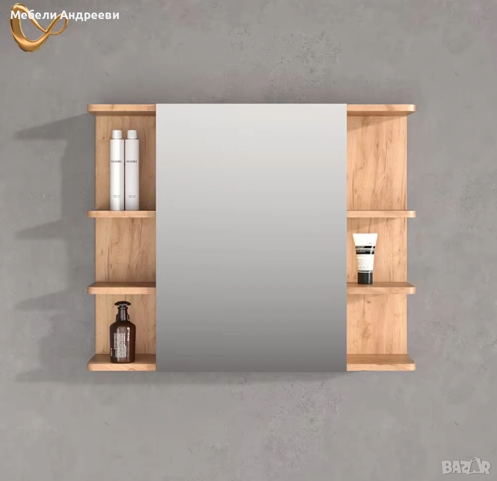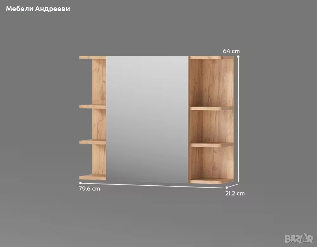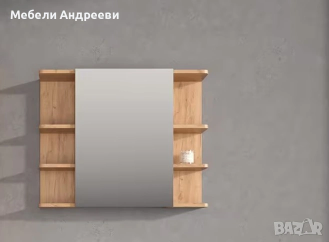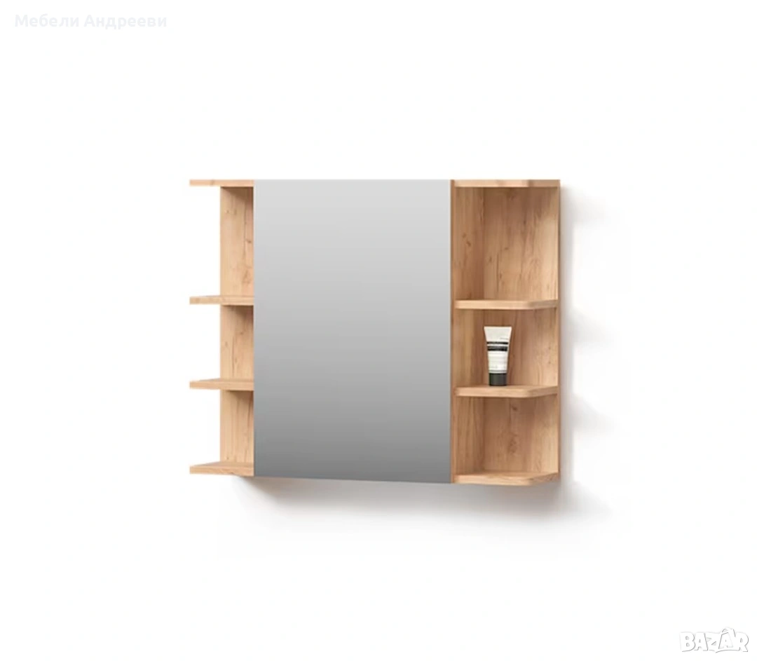 Огледалото разполага с общо шест открити рафта – по три от всяка страна. Рафтовете са удобни за козметика, принадлежности и декоративни аксесоари. Централната част е голямо огледало с чиста линия, което визуално разширява пространството и е практично за ежедневна употреба. Дъбовият корпус придава топъл и модерен вид, подходящ за всяка съвременна баня.