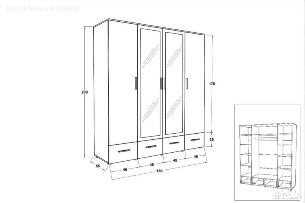 Гардеробът е използван за кратко време и е в отлично състояние – почти като нов. Поддържан е много добре и няма драскотини, петна или други следи от употреба. Всички врати се отварят и затварят плавно, а пантите и механизмите са напълно изправни. Конструкцията е стабилна и здрава.