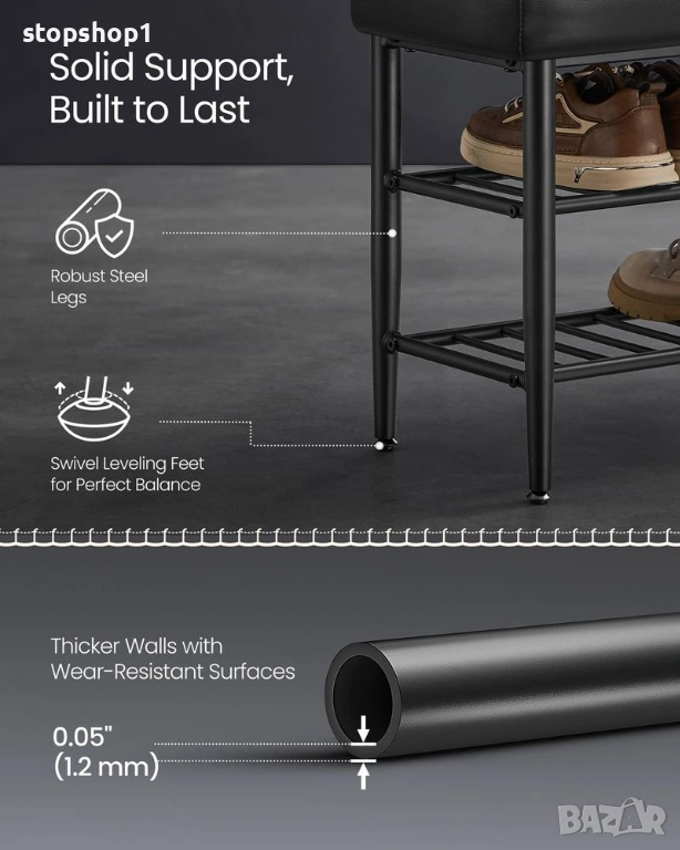 - [Здрава и стабилна] Тази пейка за антре, изработена със здрава стоманена рамка и въртящи се нивелиращи крачета, без усилие поддържа до 136 кг. Тя предлага стабилна, безклатеща се седалка, за да се подготвите удобно за деня или да се отпуснете след дълъг ден.