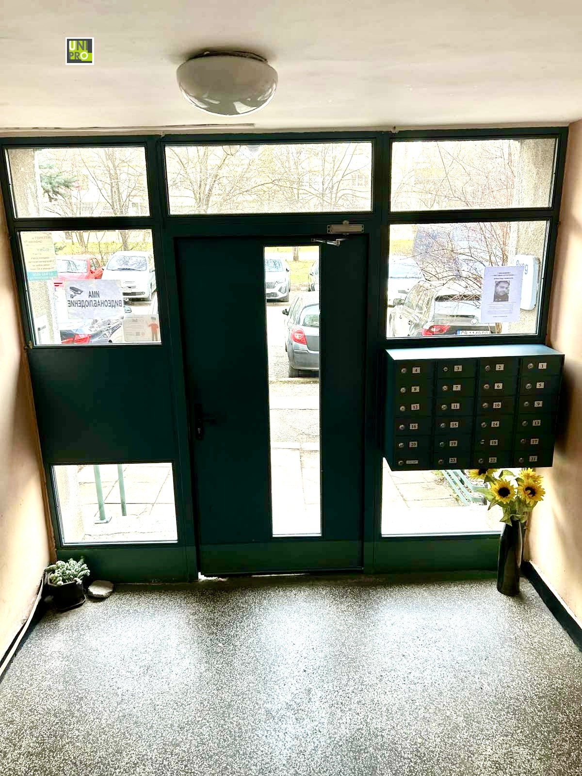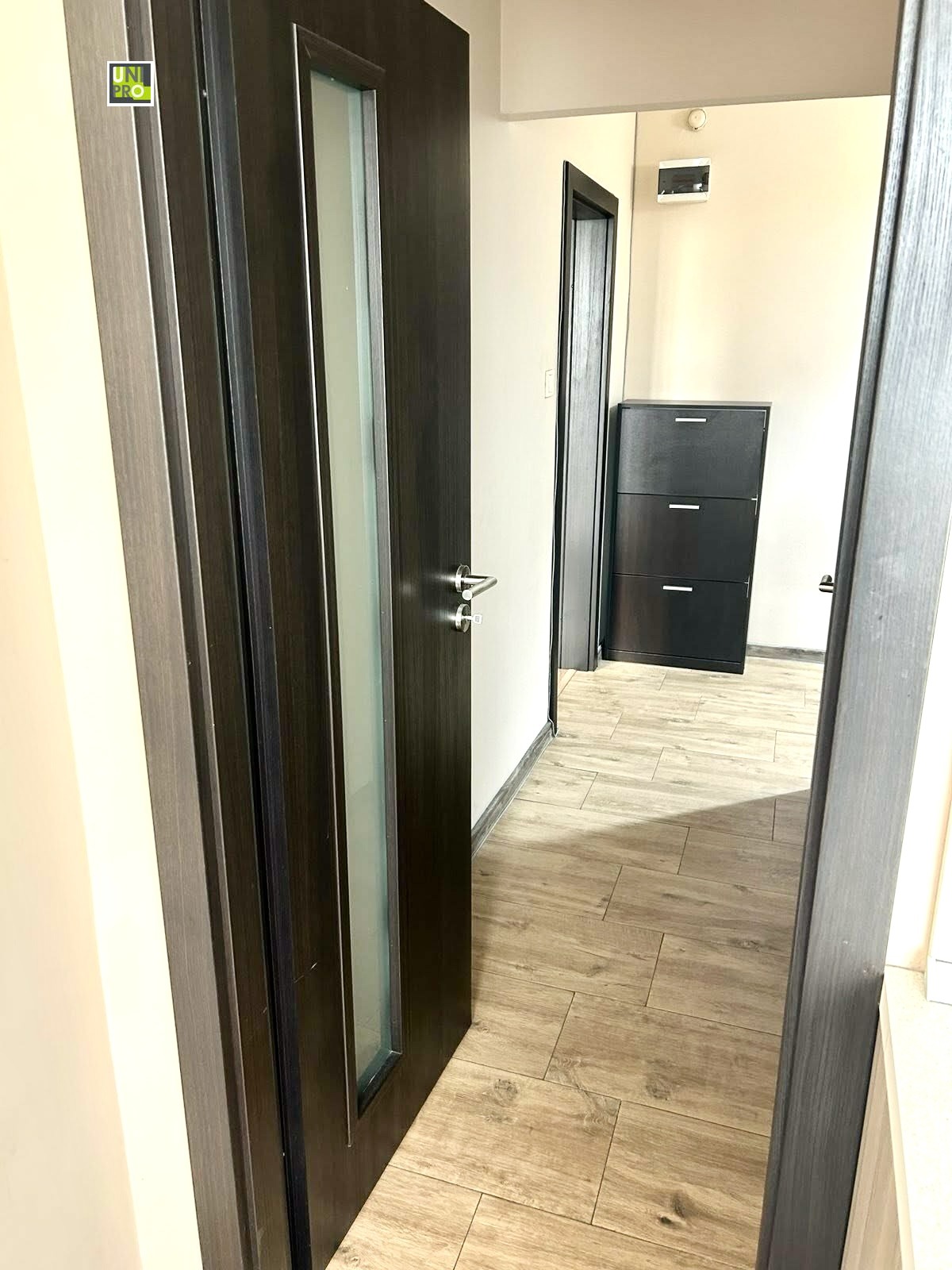 'УНИ-ПРО' продава 2-стаен непреходен апартамент в отлично състояние. Блокът е панелен от 80-те години, входът е ремонтиран и добре поддържан. Жилището е вътрешно, с 2 балкона тип лоджия и югозападно изложение и външна изолация. Състои се от голямо входно антре, дневна, спалня, кухня, и баня с тоалетна. Апартаментът е ремонтиран преди няколко години с качествени материали и е поддържан в много добро състояние. Фасадната дограма на всички стаи е сменена с PVC стъклопакет, интериорите врати са от MDF, входната е блиндирана. Настилката в антрето е гранитогрес, а в стаите ламиниран паркет. Банята е с фаянс и теракот. Стените и таваните са с гипсова шпакловка и латекс. Кухнята е с поръчкови шкафове с вградени електроуреди. В антрето има голям поръчков вграден гардероб. Апартаментът се продава с обзавеждането, което е на снимките.