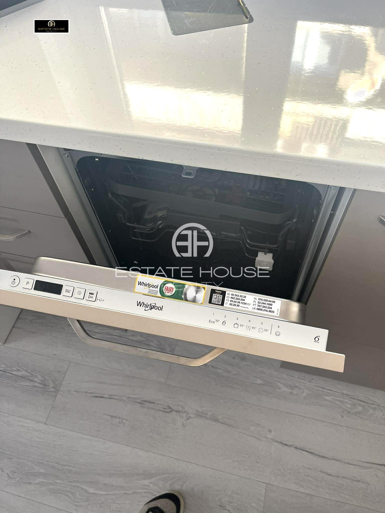 Апартаментът се отдава напълно обзаведен и оборудван с нови мебели и електроуреди, необходими за едно съвременно домакинство. Кухненската част разполага със съдомиялна машина, а в жилището са осигурени също сушилня и телевизор. Всичко в имота е чисто ново и апартаментът очаква своите първи наематели. Отоплението е решено с климатици, което осигурява комфорт през цялата година.