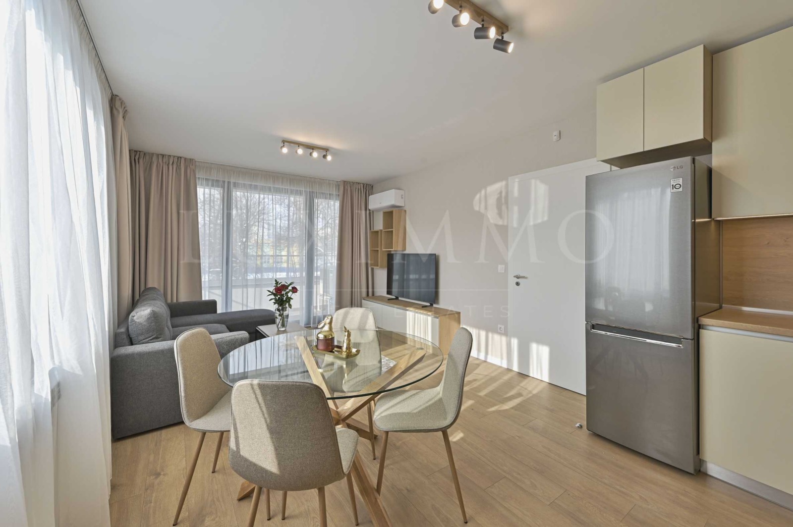 Всекидневна с кухненски кът обзаведена със стилен диван, трапезна маса и телевизор, а кухнята разполага с всички уреди от висок клас: хладилник, фурна, керамични котлони, абсорбатор и пералня;