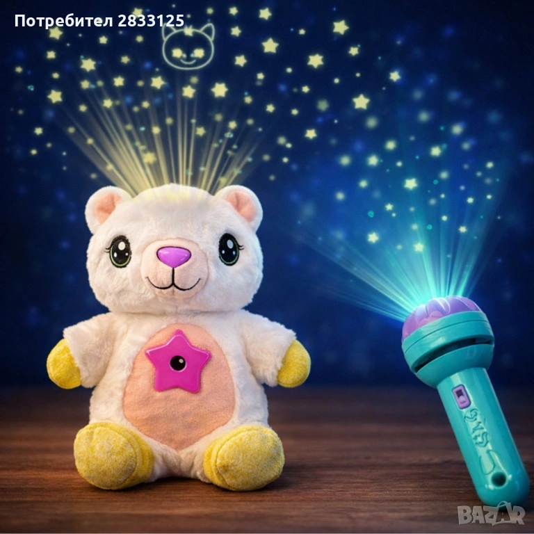 Плюшена играчка и проектор звездно небе мече с фенер.
