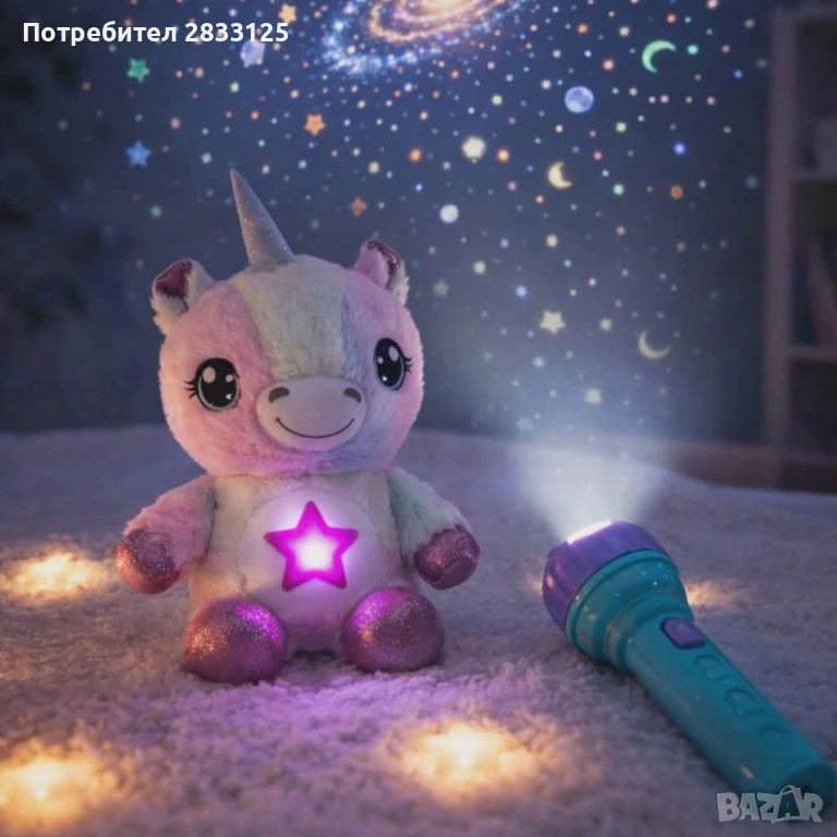 Плюшена играчка и проектор звездно небе еднорог с фенер;