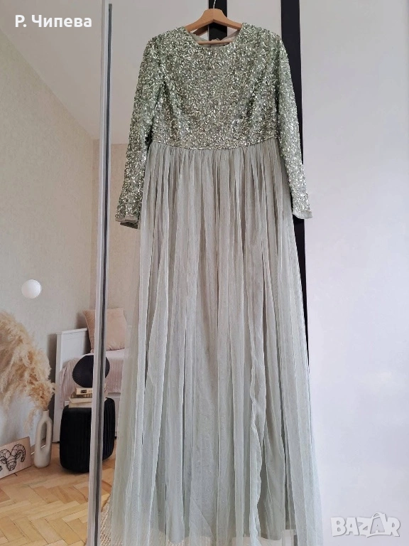 Цялата горна част е обшита гъсто-гъсто с пайети, долната е с тюл.