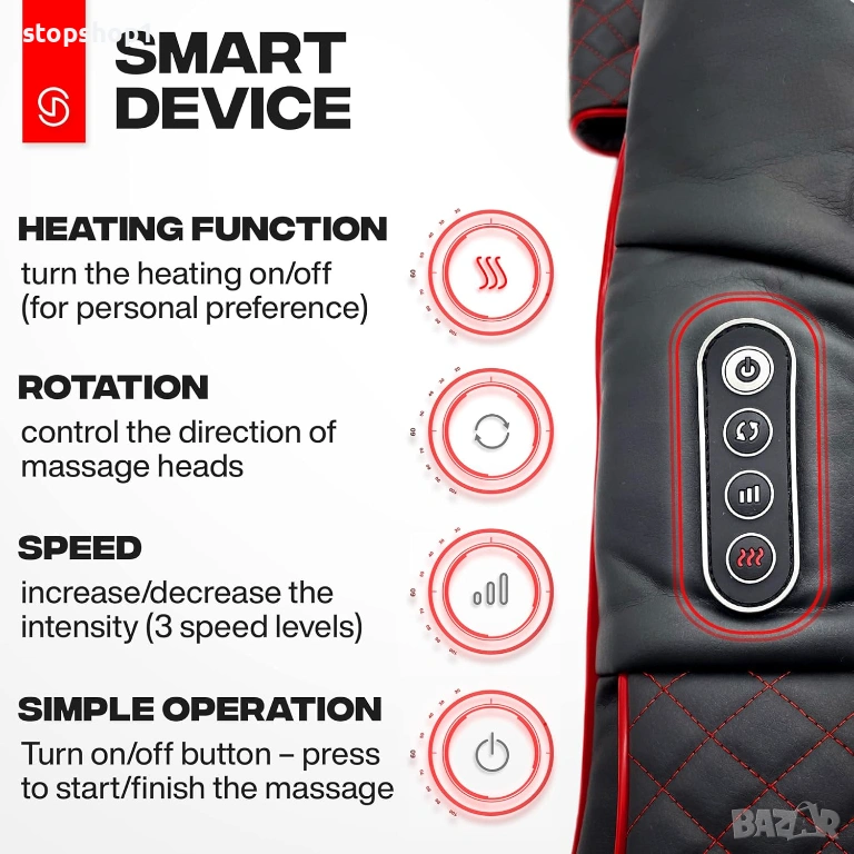 - ПРЕМИУМ ХАРАКТЕРИСТИКИ: Искаме да ви осигурим най-релаксиращото и полезно изживяване, затова нашият масажор за врата, раменете, гърба и краката има регулируема интензивност, технология за ниско ниво на шум и двупосочно въртене, което се променя след 1 минута. Устройството е безопасно за употреба – разполага с технология за автоматично изключване, която го изключва след 15 минути (един препоръчителен сеанс на масаж) и защита от прегряване. Изработен е и от PU кожа и дишаща мрежа – лесни за почистване материали.
