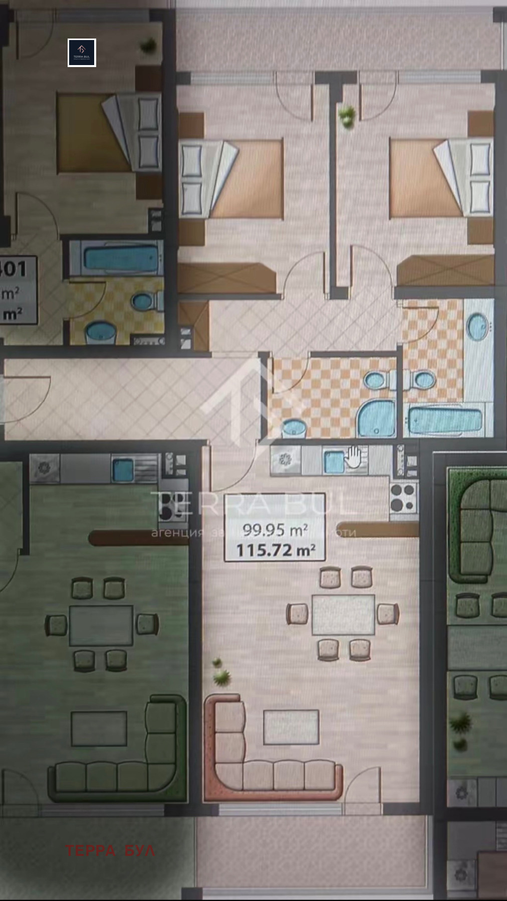 Апартаментът е разположен на 4-ти етаж и е с обща площ от 115.72 кв.м, от които 99.95 кв.м чиста жилищна площ. Към имота има и мазе.