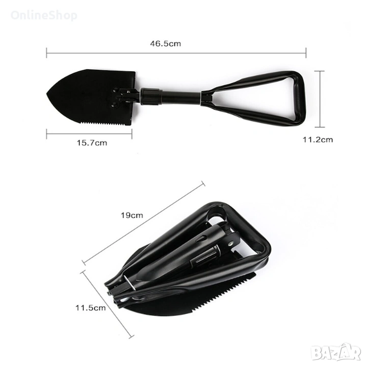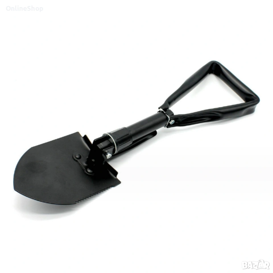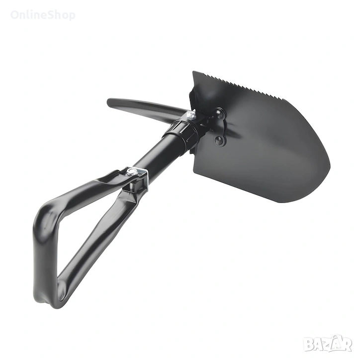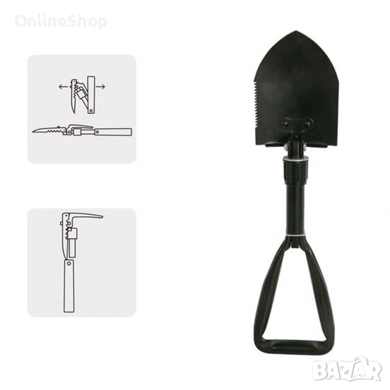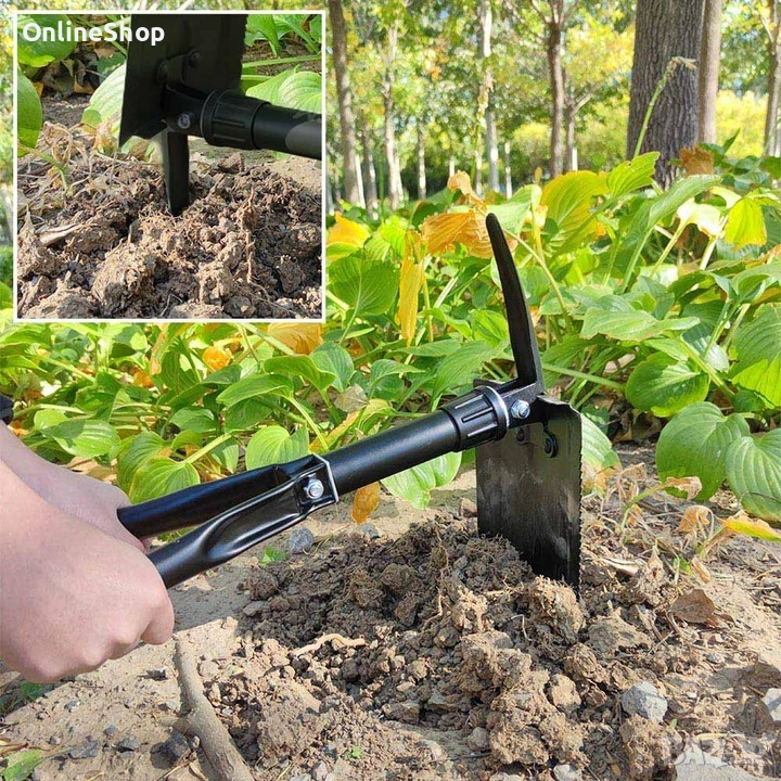 Компактна сгъваема градинска лопата с 3 в 1 функционалност - лопата, мотика и трион. Изработена от висококачествен метал, с удобна дръжка за лесно и ефективно използване в градината.
