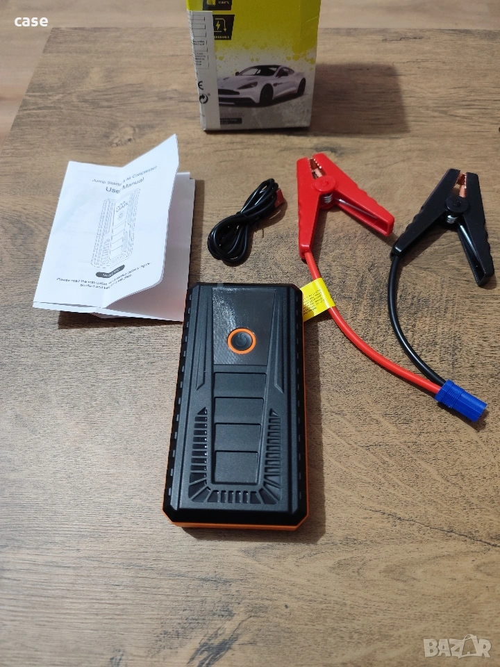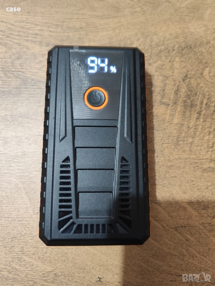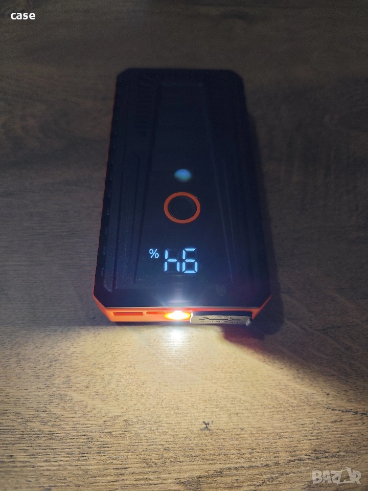 Мощен стартер за автомобили 12V ,стартира автомобили с паднал акумулатор за секунди.Устройството е леко и удобно,като не заема място и може лесно да се събере в чанта или някое отделение на автомобила.Единственото нещо което трябва да направиш е да свържеш червени и черния кабел с +и- и да натиснеш бутона за старт.Устройството е и като подвижна батерия и може да зарежда бързо два смартфона ,таблет или друго .Има USB и type C изход.Устройстото се зарежда с тype C кабел,който е включен в комплекта.Устройството има също така мощен фенер който може да ви помогне вечер.