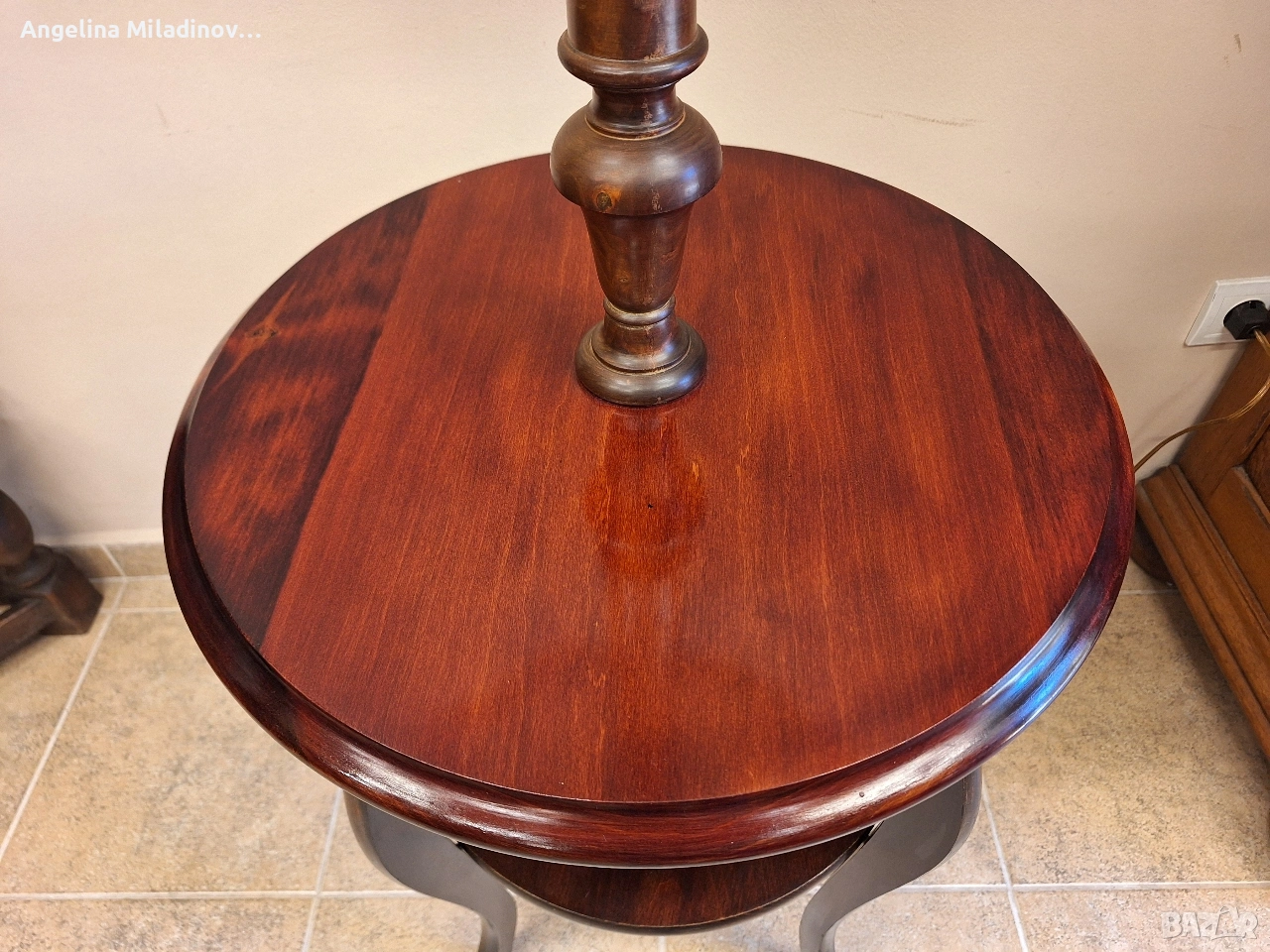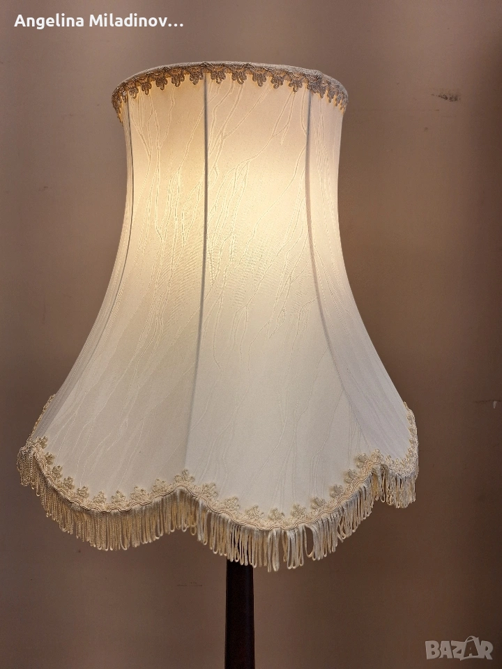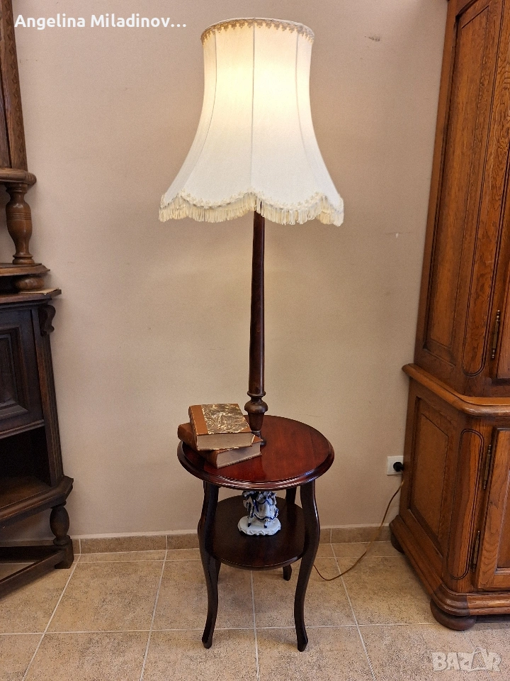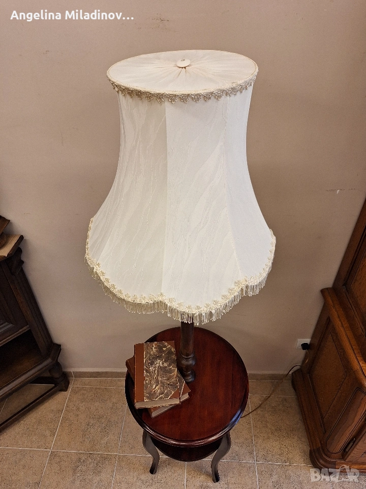 УНИКАТ! Маса Луи XV и лампион. К - т Маса Луи XV и лампион с голям абажур, внос от Дания. Интересна маса на две нива изработена от череша масив в комплект с лампион . Абажура на лампиона е с приятни извивки цвят шампанско и красиви ресни. Основата на лампата е череша. Невероятно допълнение към дома! Разгледайте и другите ми обяви. Последвайте ни и във фейсбук Мебели шик. Предлагаме и изгоден транспорт за цялата страна. Размери: Диаметър - 52 см. Височина - 193 см. Цена - 200 €. 391,17 лв. vintagemebel.olx.bg