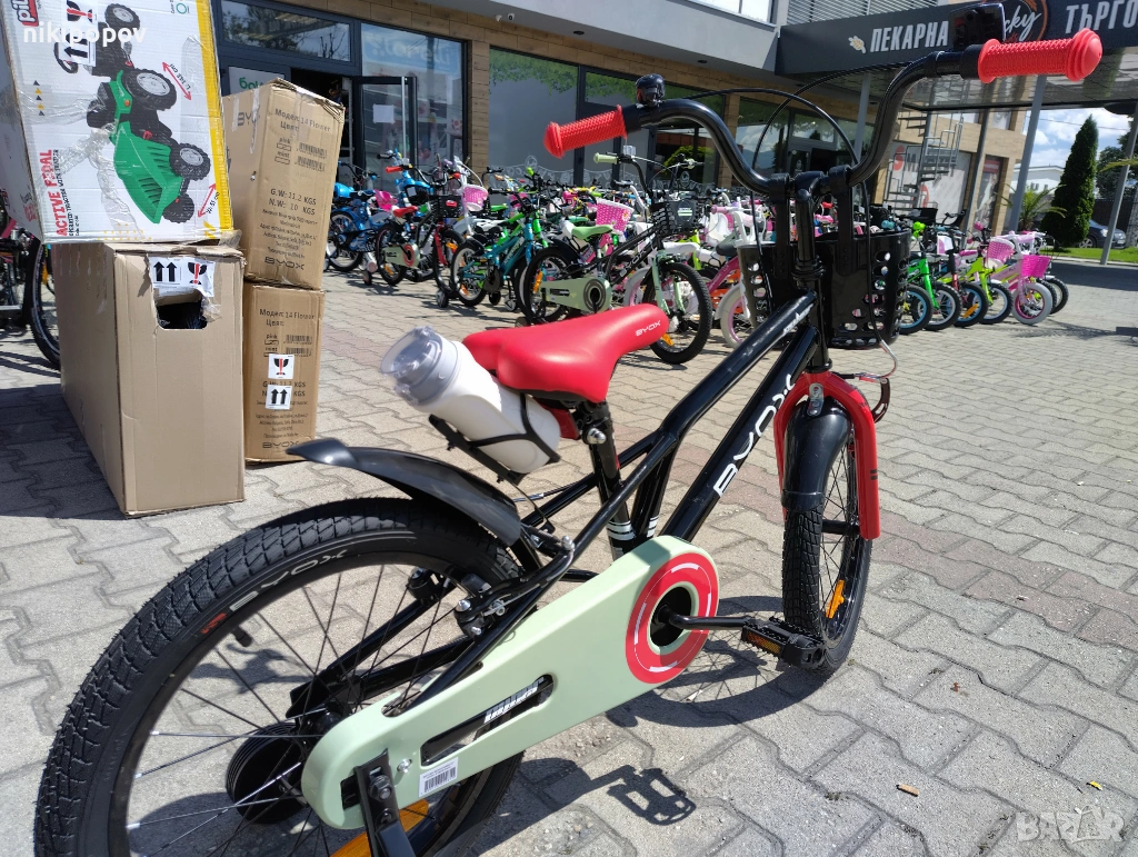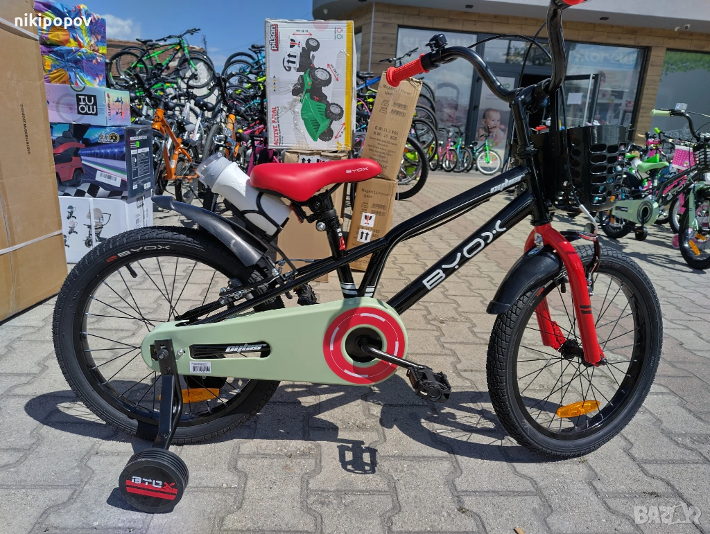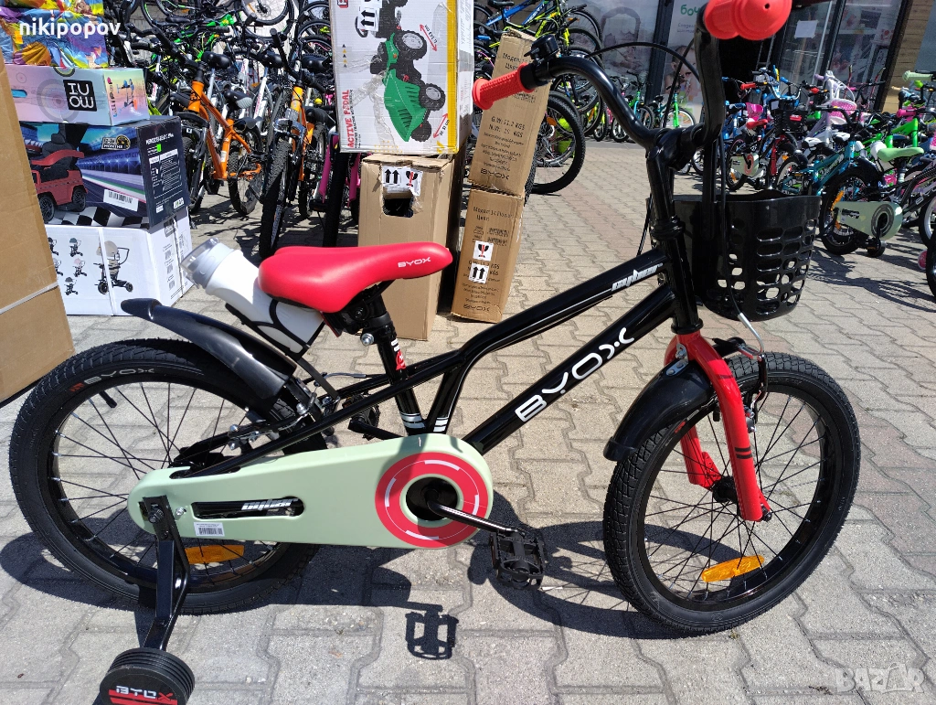*Детският велосипед на Byox Bikes е един прекрасен избор за децата между 5 и 7-годишна възраст и височина от 110 до 130см. Возилото е снабдено с помощни колела, посредством които детето ще усъвършенства умението си да балансира на две гуми неусетно. Рамката е метална. Разполага с предна и задна V-brake спирачка, пластмасови калници и предпазител на веригата.