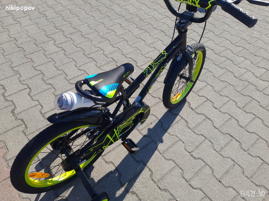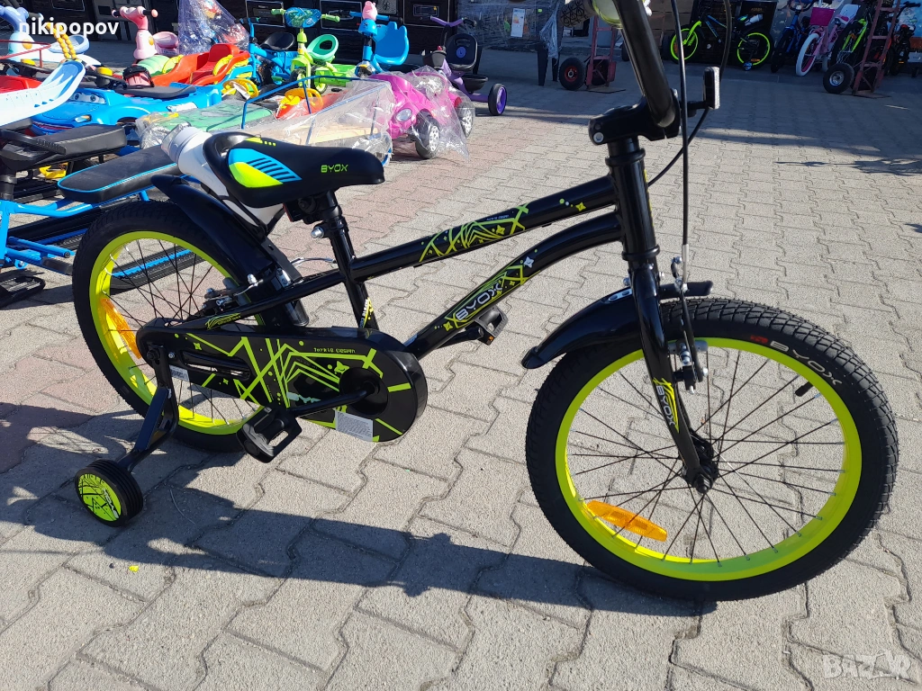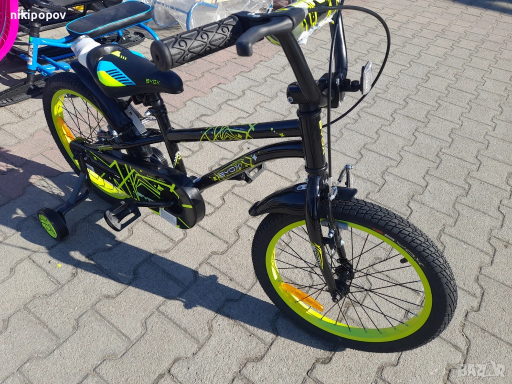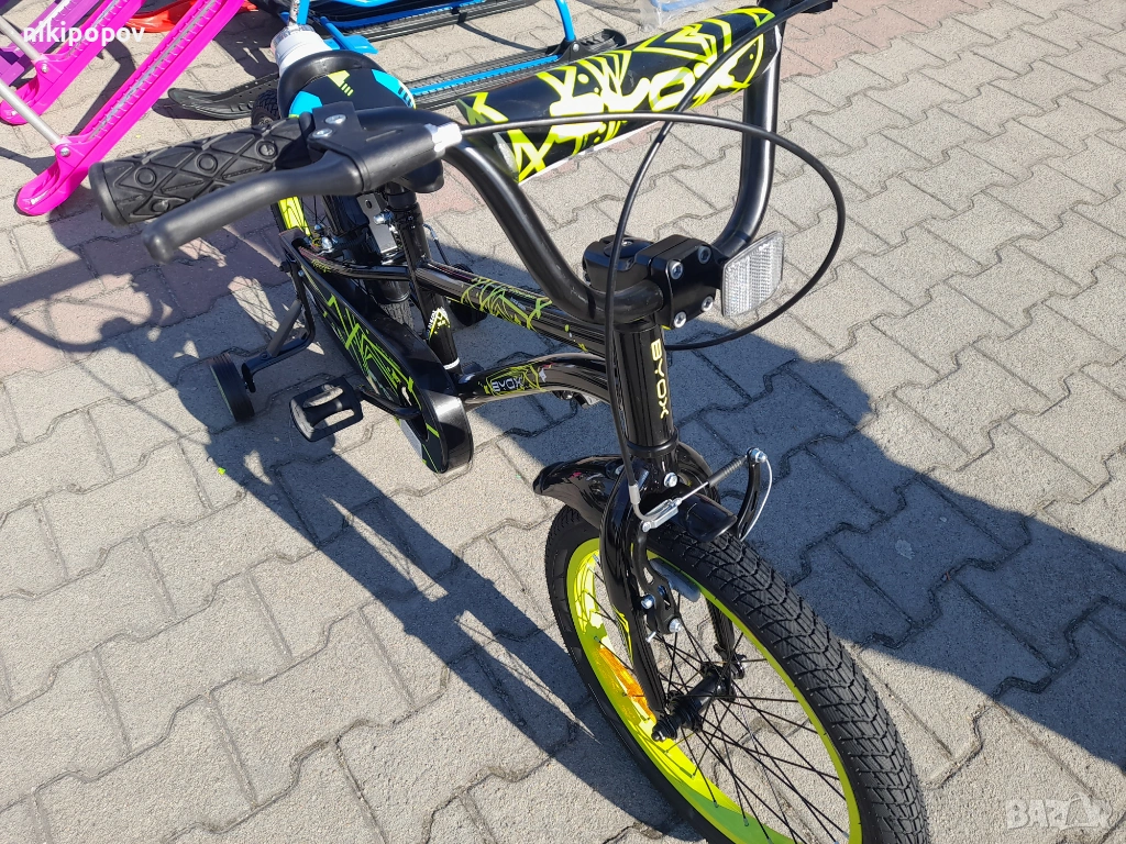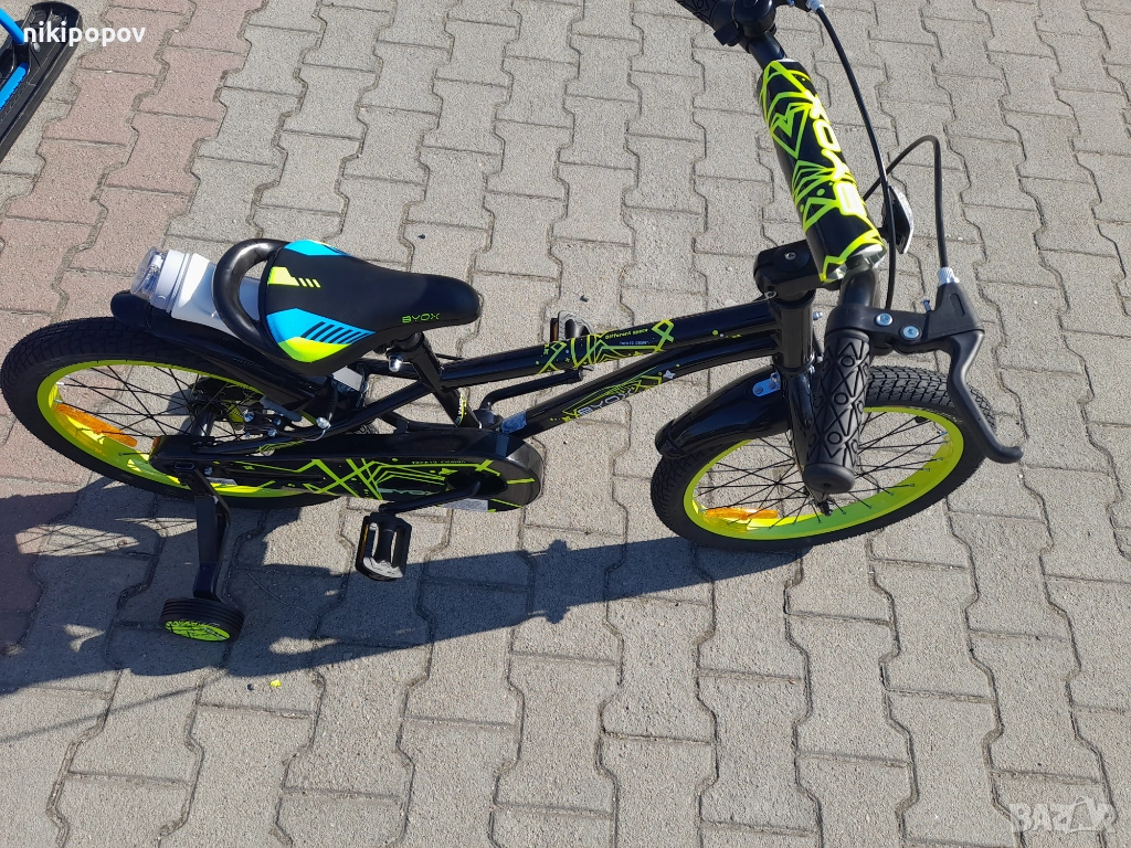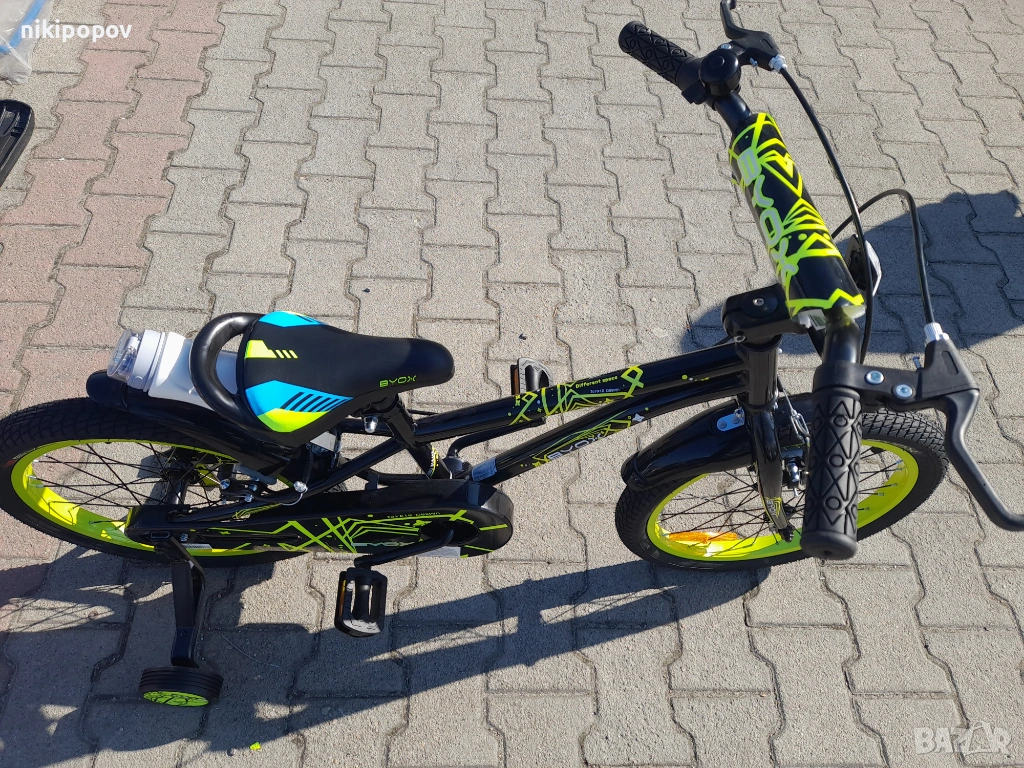 *Детският велосипед на Byox Bikes е един прекрасен избор за децата между 5 и 7-годишна възраст и височина от 110 до 130см. Возилото е снабдено с помощни колела, посредством които детето ще усъвършенства умението си да балансира на две гуми неусетно. Рамката е метална. Разполага с предна и задна V-brake спирачка, пластмасови калници и предпазител на веригата.