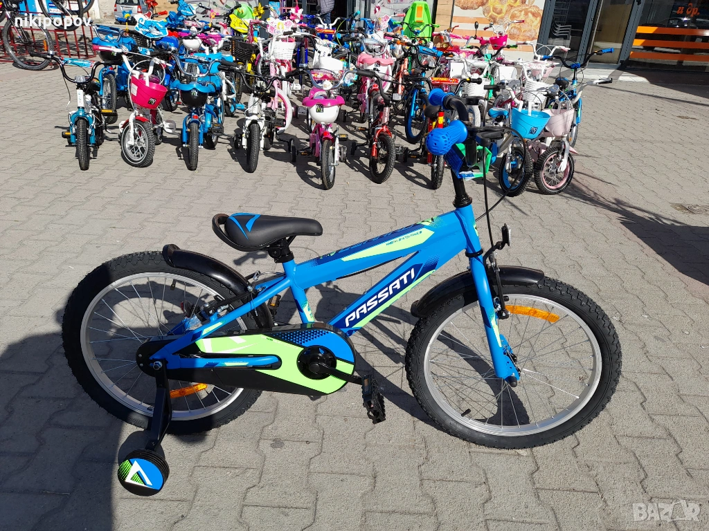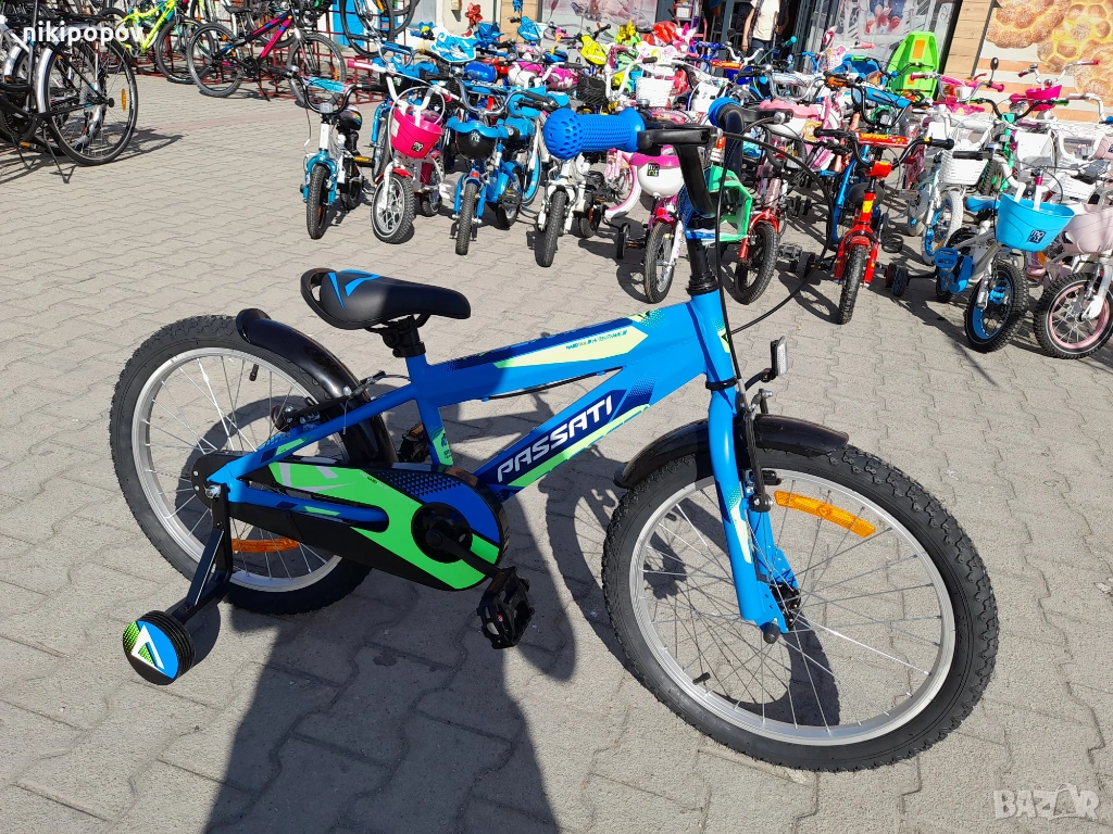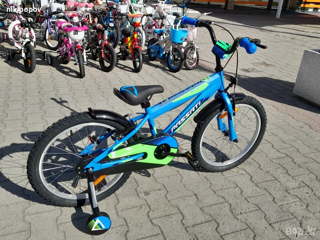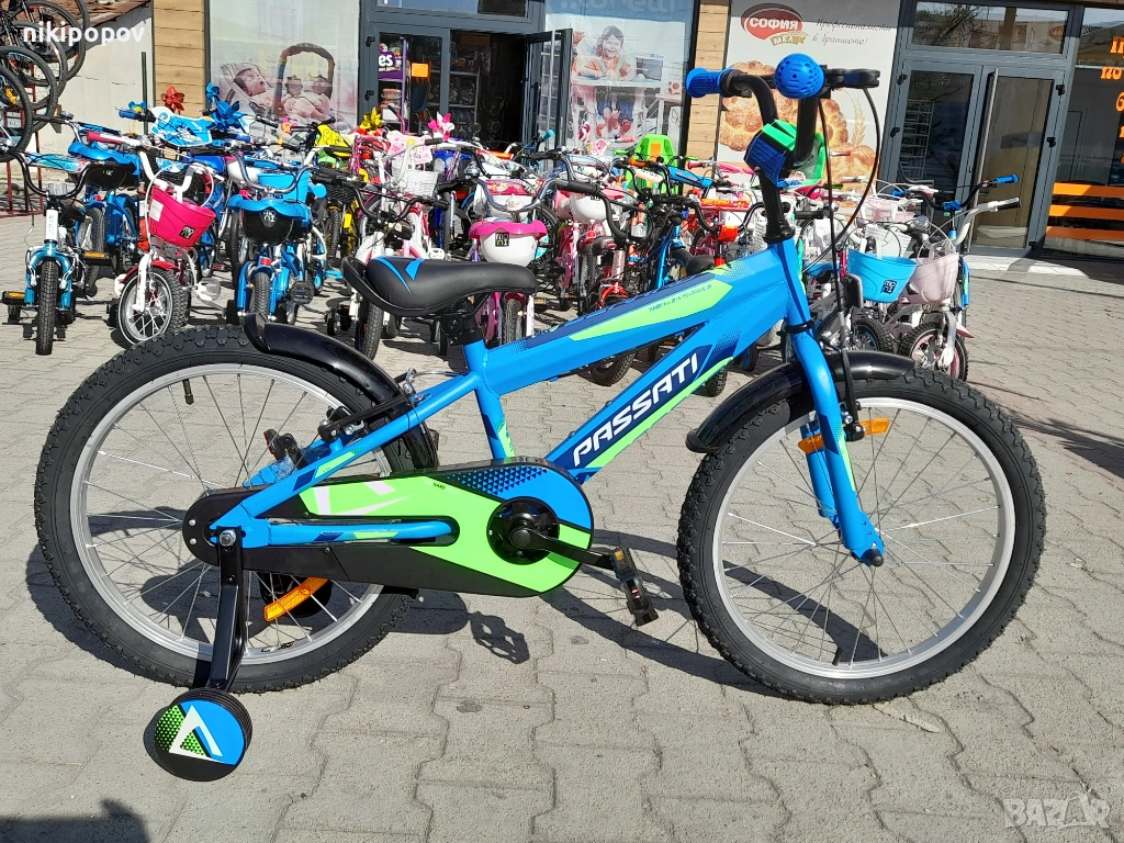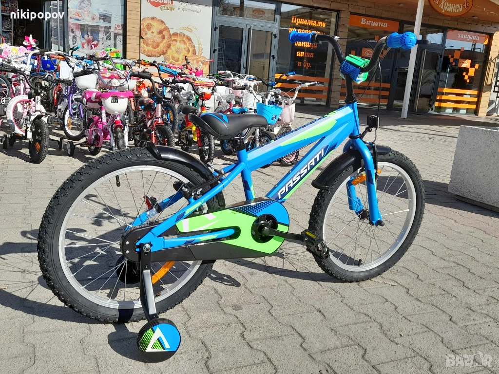 *Детският велосипед на Passati Bikes е един прекрасен избор за децата между 6 и 8-годишна възраст и височина от 120 до 140см. Возилото е снабдено с помощни колела, посредством които детето ще усъвършенства умението си да балансира на две гуми неусетно. Рамката е стоманена. Разполага с предна и задна V-brake спирачка, пластмасови калници и предпазител на веригата.