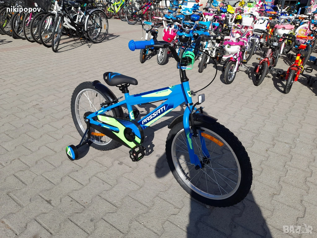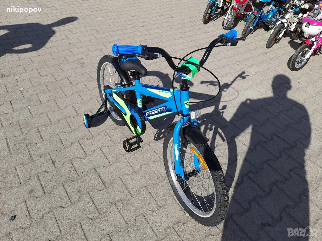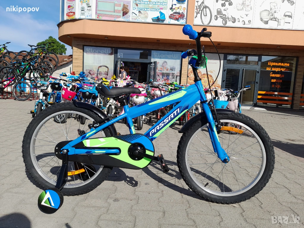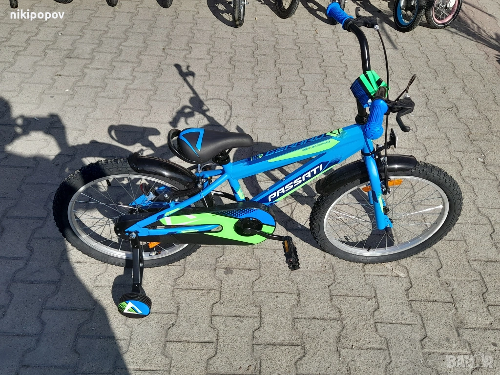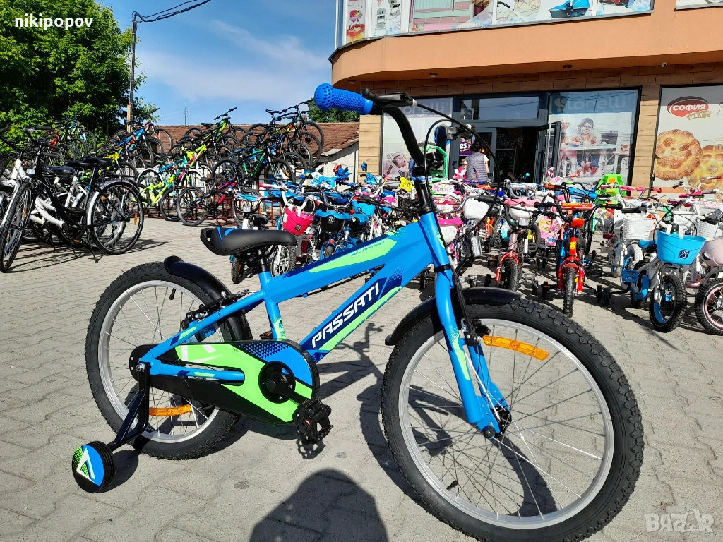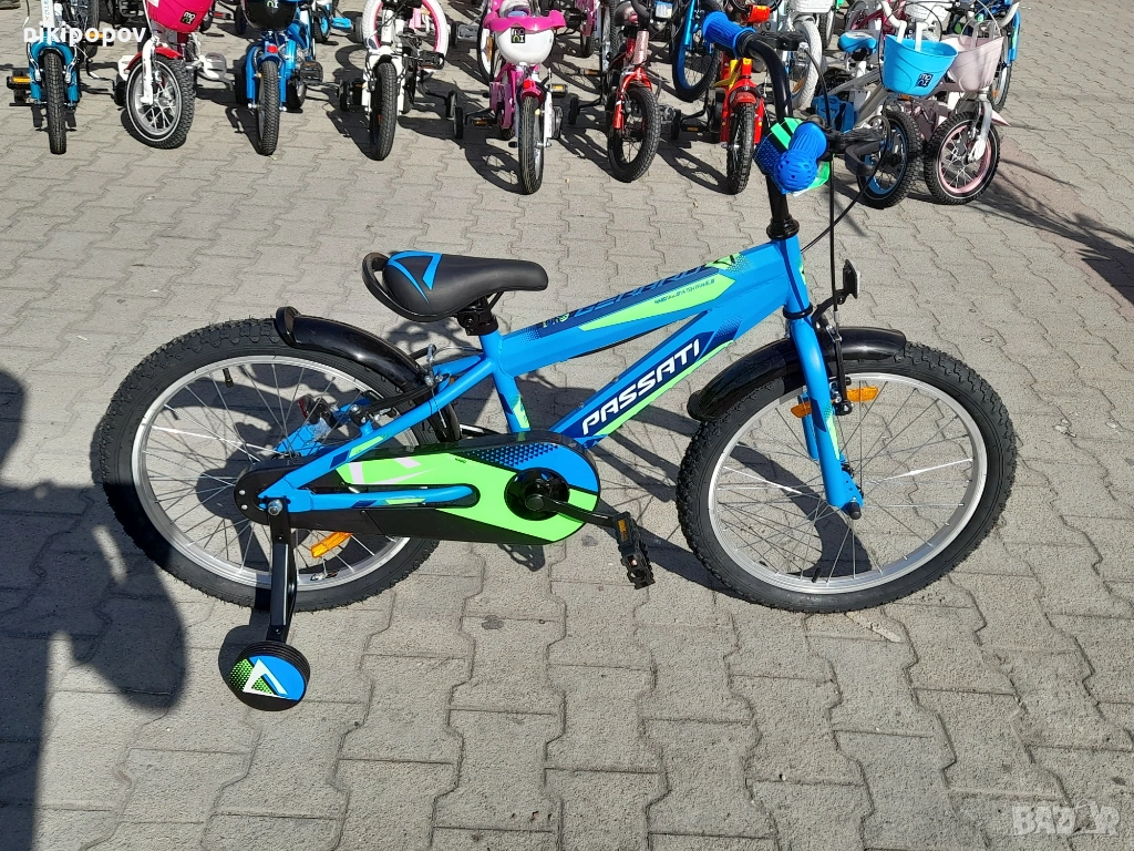 *Детският велосипед на Passati Bikes е един прекрасен избор за децата между 6 и 8-годишна възраст и височина от 120 до 140см. Возилото е снабдено с помощни колела, посредством които детето ще усъвършенства умението си да балансира на две гуми неусетно. Рамката е стоманена. Разполага с предна и задна V-brake спирачка, пластмасови калници и предпазител на веригата.