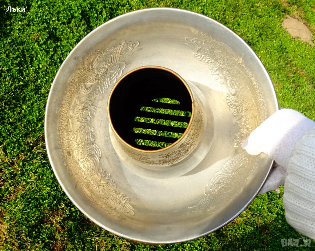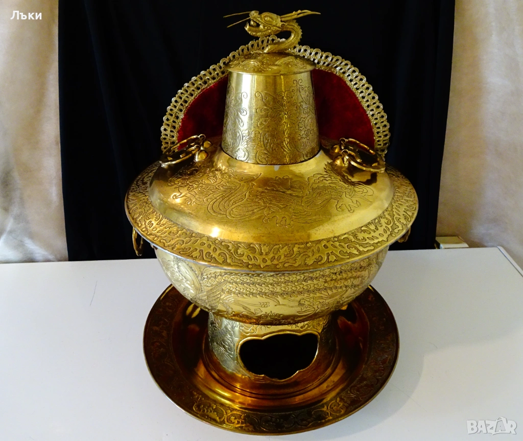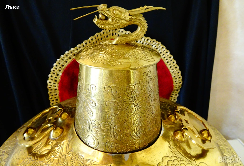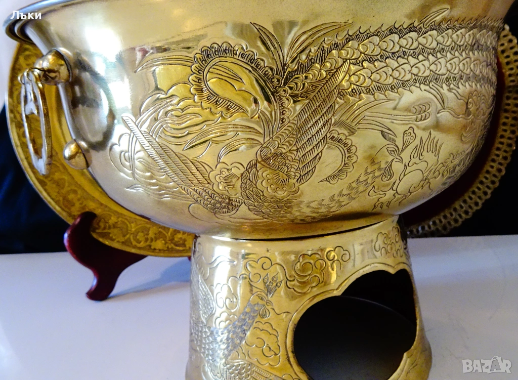 от огнени езици и приказни орнаменти.От вън е позлатен,а от вътре е