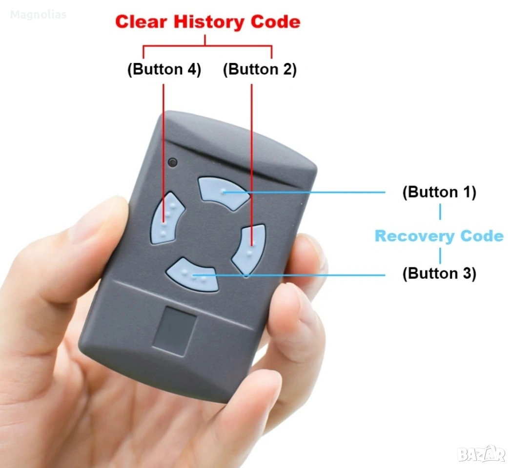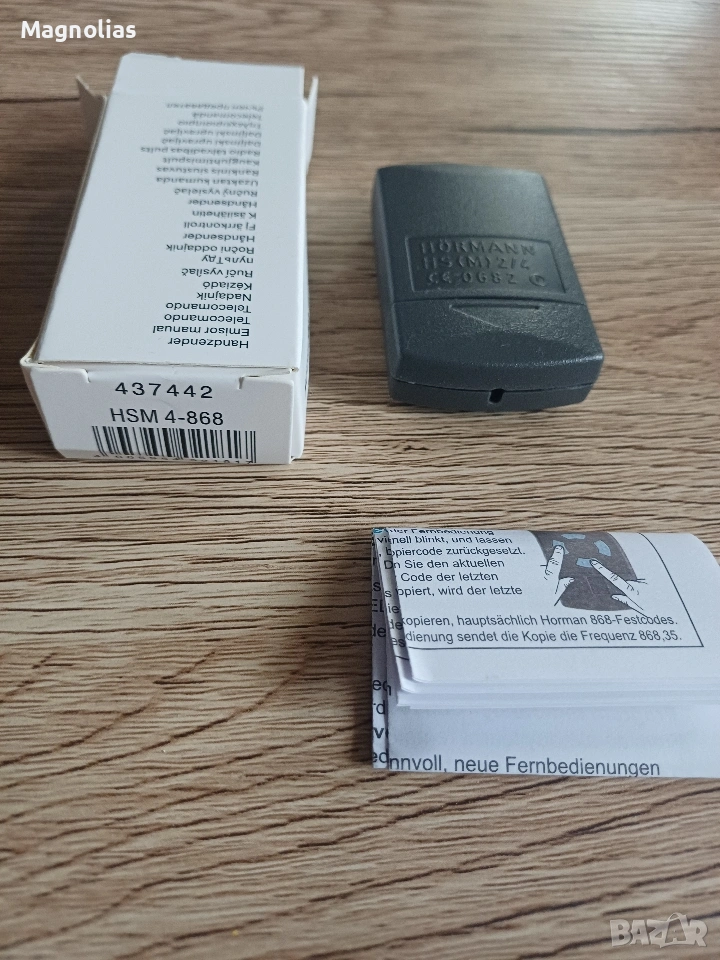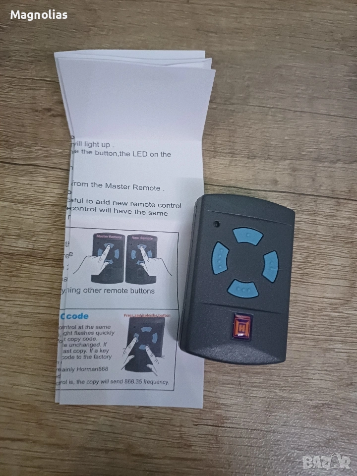 Дистанционно Управление за HORMAN HSM2 HSM4 HSE2 HSE4 HS1 HS2 HS4 HSZ1 HSZ2 HSP4 868 Mhz Клонинг ОПИСАНИЕ ДОПЪЛНИТЕЛНА ИНФОРМАЦИЯ Клонинг Horman За Гаражни Врати Дистанционно 868 Mhz Серия HORMAN BS Не Може да Бъде Клонирован! Списък за Съвместимост: Horman hsm2 868 , hsm4 868, Horman hs1 868, hs2 868, hs4 868, Horman hse2 868, hse4 868 Horman hsz1 868, hsz2 868, Horman hsp4 868, hsp4-c 868, Horman hsd2-A 868, hsd2-c 868 Той е Съвместим Само със Синя Бутон!!! Horman 868 Mhz Технически характеристики: Тип програмиране: самокопирование Брой канали: 4 Монтаж: безжична За Такива като електрически телескопичен дистанционно управление на вратата дистанционно управление пътни врати, дистанционно управление, аларма и така нататък. Обхват на безжичен трансфер: 20-5О (м). (открито пространство) Честота: 868 Mhz, 868,3 Mhz Употреба: ръководство Как да програмирате - това е много просто! 1: Натиснете бутон A и B непрекъснато, докато led не мигнет 3 пъти. 2. Отпуснете бутона B (продължете да натискате бутона A) и бавно натиснете бутона B 3 пъти, led мига. 0т - 15 EUR и 2О EUR. Не Се Коментира Цена!