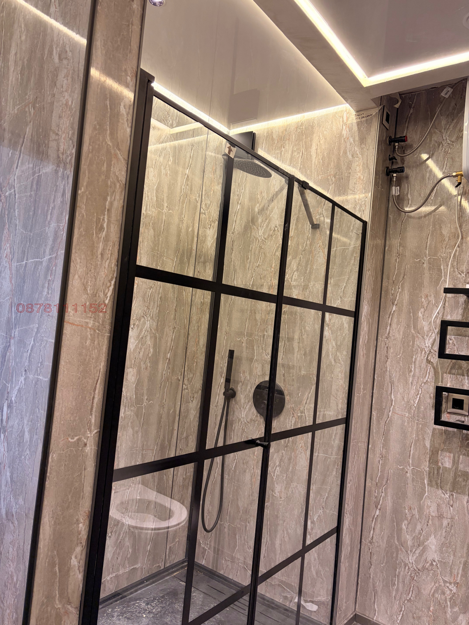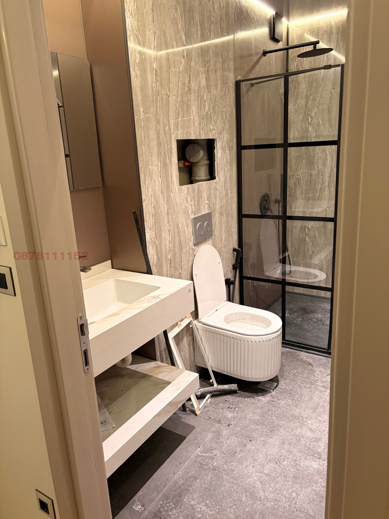 Банята е оборудвана с душ кабина, душ батерия, интимен душ, вградена тоалетна, умивалник, огледало, шкафчета и различни аксесоари. Дизайнът е стилен и съчетава елементи от мрамор и метал, което придава на банята изтънчен и съвременен вид.