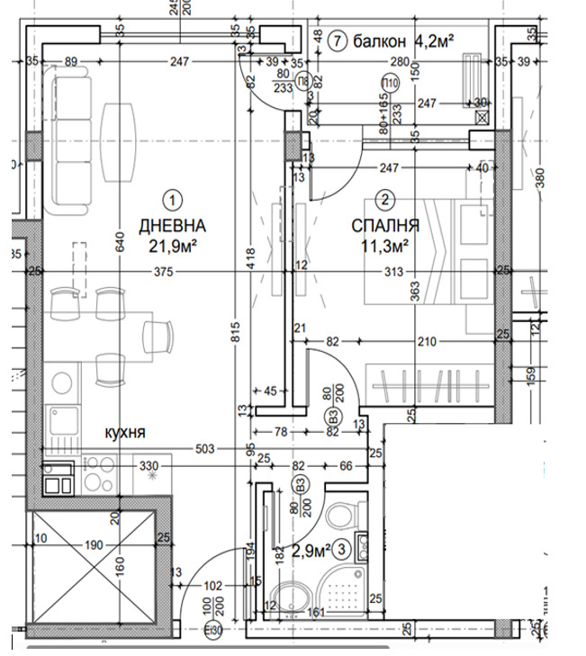 Апартаментът е на шпакловка и замазка, с изложение североизток и се състои от: дневна с кухненски бокс, спалня, баня с тоалетна, балкон, входно антре.
