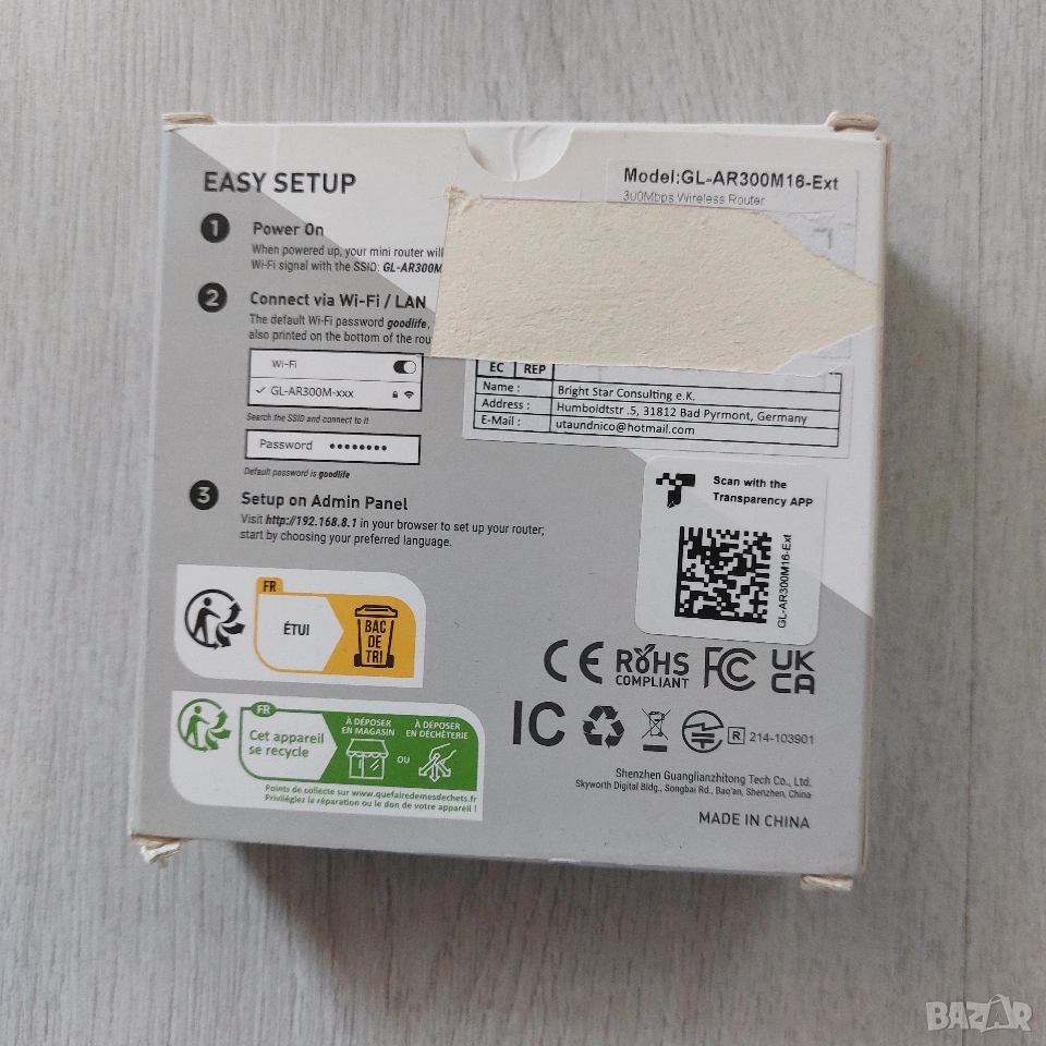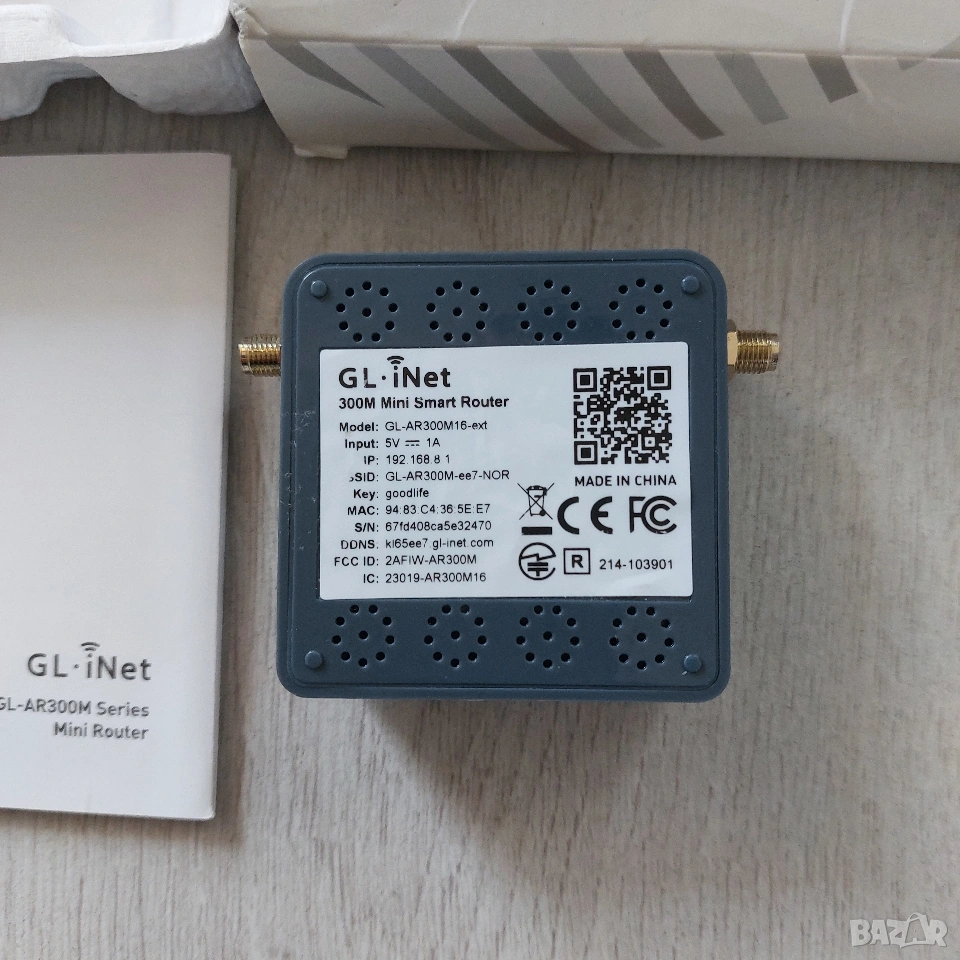 Комплект: Рутер GL-AR300M16-Ext, 2 броя оригинални антени, Micro USB кабел за захранване, оригинална кутия и инструкции.