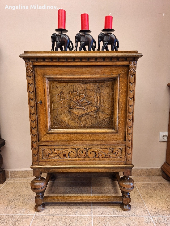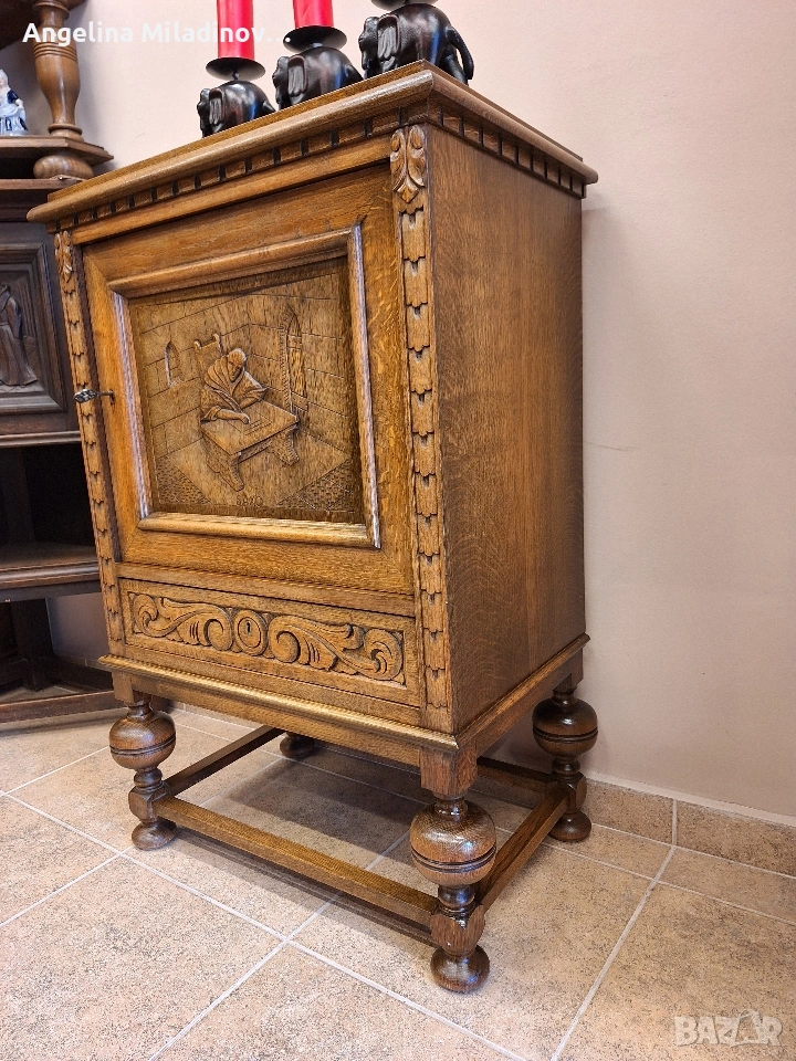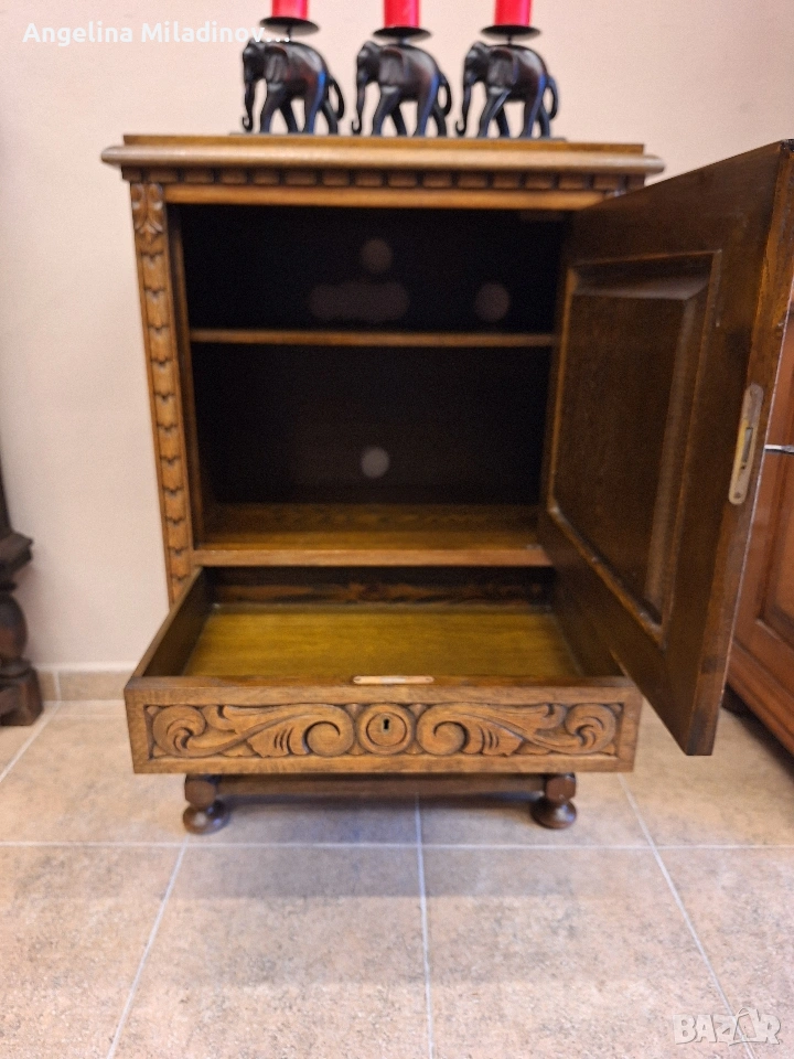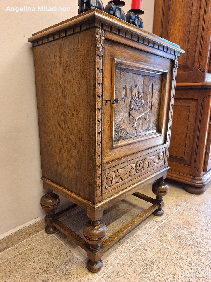 Винтидж шкаф с богата дърворезба. Шкаф, изработен изцяло от дъбова дървесина, внос от Дания. Невероятно красив и различеншкаф с вратичка с богата дърворезба и практично чекмедже. Изключително красива мебел! Подходящ за всеки кът от вашия дом, вила или барбекю..Разгледайте и другите ми обяви. Последвайте ни и във фейсбук Мебели шик. Предлагаме и изгоден транспорт за цялата страна. Размери: Дължина - 63 см. Ширина - 40 см. Височина - 95 см. Цена -200 €. 391,17 лв. vintagemebel.olx.bg