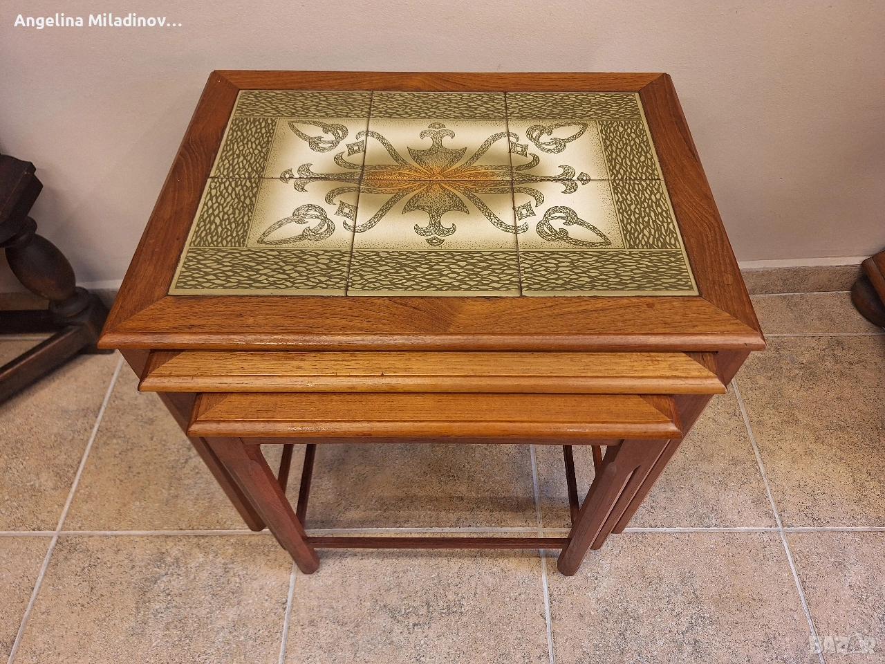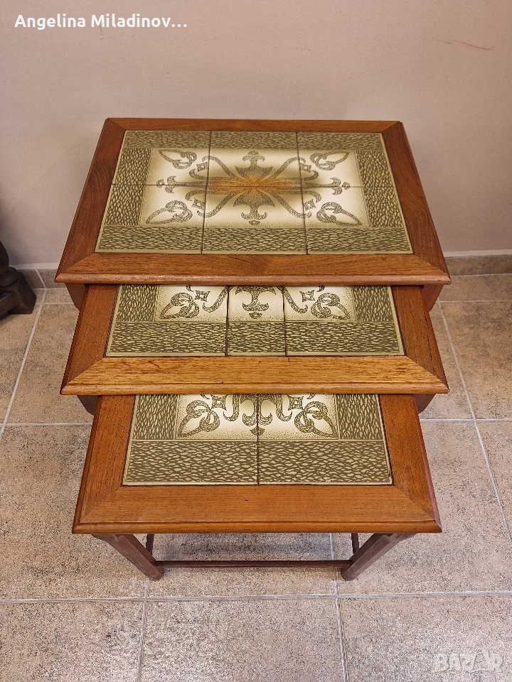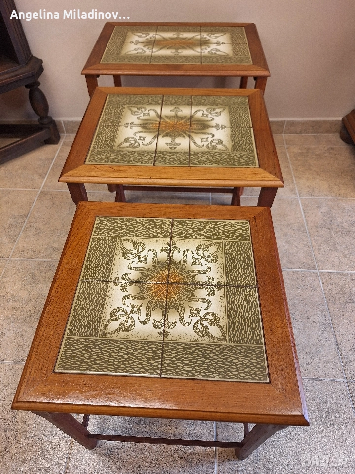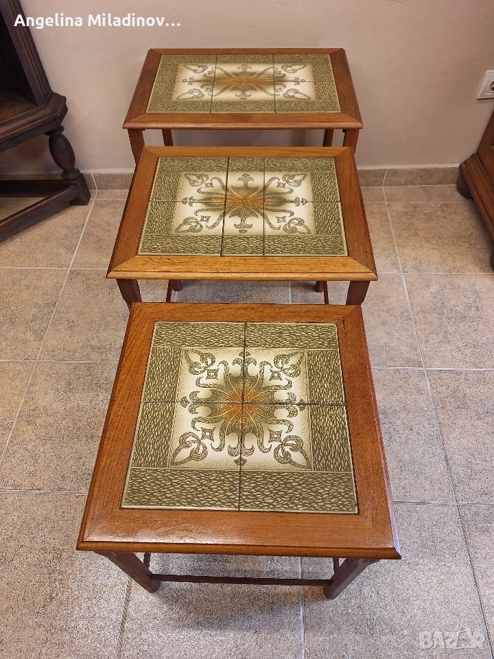 три помощни масички с плочки. Тройка помощни масички с порцеланови плочки, внос от Дания. Трите масички влизат чрез улеи една под друга. Удобни за всекидневна, тераса, веранда или друга част от дома ви. Отлично състояние. Разгледайте и другите ми обяви. Последвайте ни и във фейсбук Мебели шик. Предлагаме и изгоден транспорт за цялата страна. Размери: Голяма - 55/40/47 см. Средна - 48/40/45 см. Малка - 40/40/44 см. Цена - 98 € 191,67 лв. vintagemebel.olx.bg