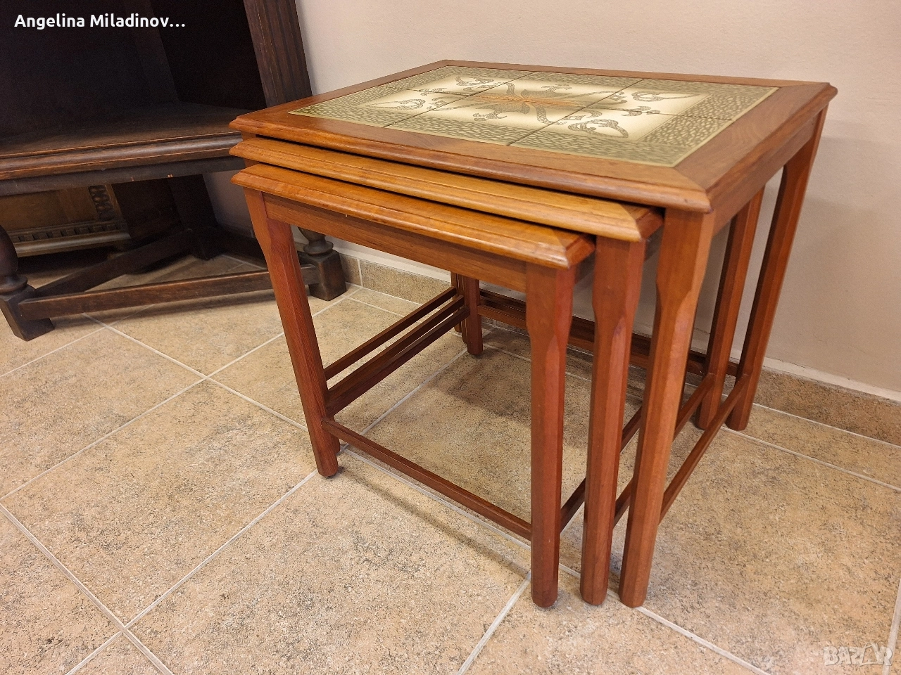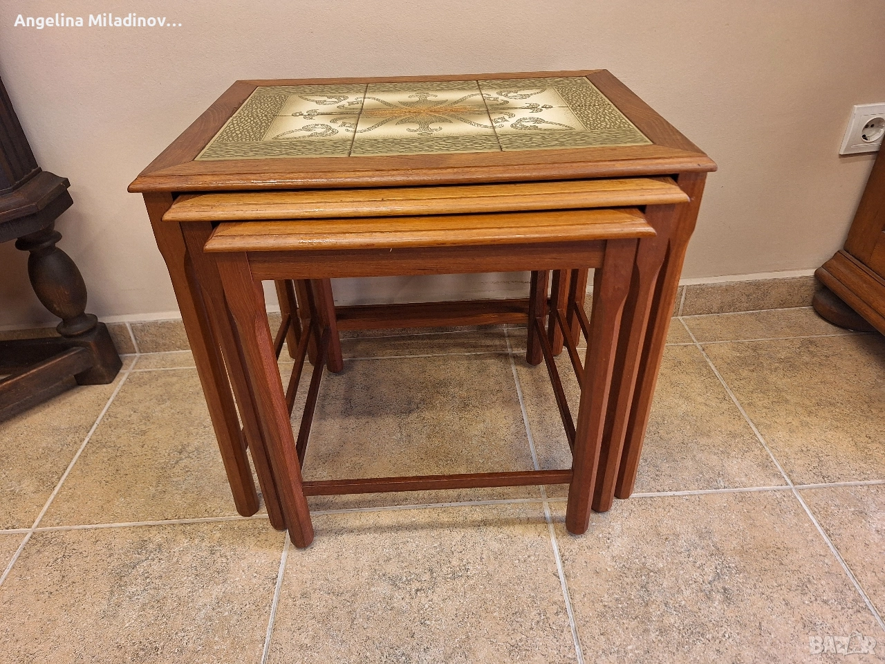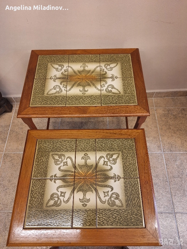 три помощни масички с плочки. Тройка помощни масички с порцеланови плочки, внос от Дания. Трите масички влизат чрез улеи една под друга. Удобни за всекидневна, тераса, веранда или друга част от дома ви. Отлично състояние. Разгледайте и другите ми обяви. Последвайте ни и във фейсбук Мебели шик. Предлагаме и изгоден транспорт за цялата страна. Размери: Голяма - 55/40/47 см. Средна - 48/40/45 см. Малка - 40/40/44 см. Цена - 98 € 191,67 лв. vintagemebel.olx.bg