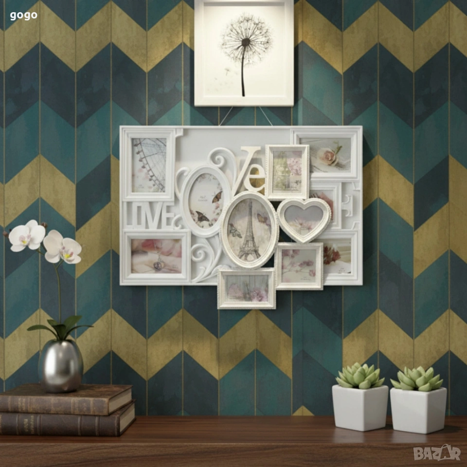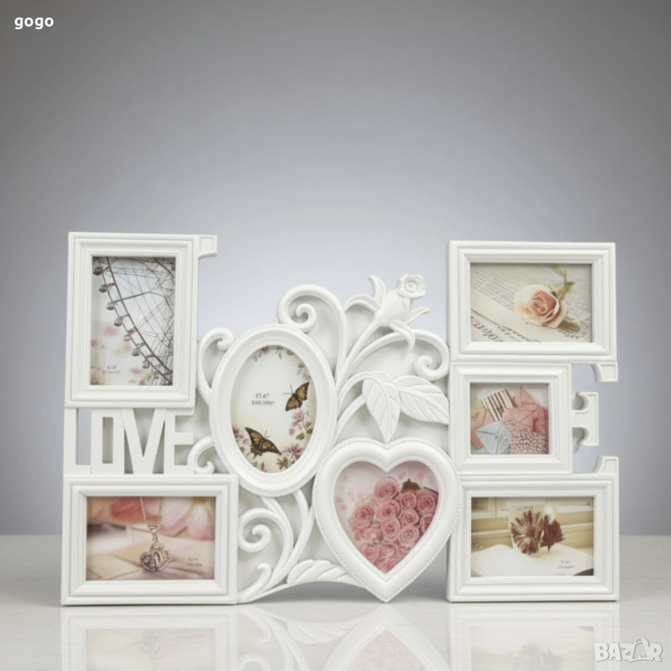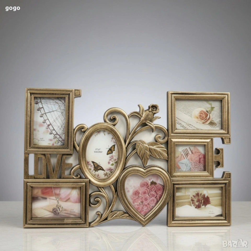 Любовна Феерия – декоративна фоторамка за 7 снимки Цена: 18 евро Снимките ти са разпръснати, а у дома липсва романтичен акцент? Многорамковата фоторамка Love (61×40,5 см) събира до седем снимки в различни форми – овал, сърце, правоъгълник – и ги обединява под надписа „Love“. Елегантният декоративен елемент с листа и роза подчертава темата, а изборът между бяло и антично бронзово позволява да се впише в различни интериори. Изработена от здрава пластмаса със стъклени панели, рамката се монтира лесно на стена, снимките се сменят без усилие и остават защитени от прах. Няма нужда от множество отделни рамки – получаваш цялостна композиция с един монтаж. Тя съчетава практичност и емоция, превръщайки се в акцент във всяка стая. Така подреждаш спомените си, освежаваш дома и имаш прекрасен подарък за близки.