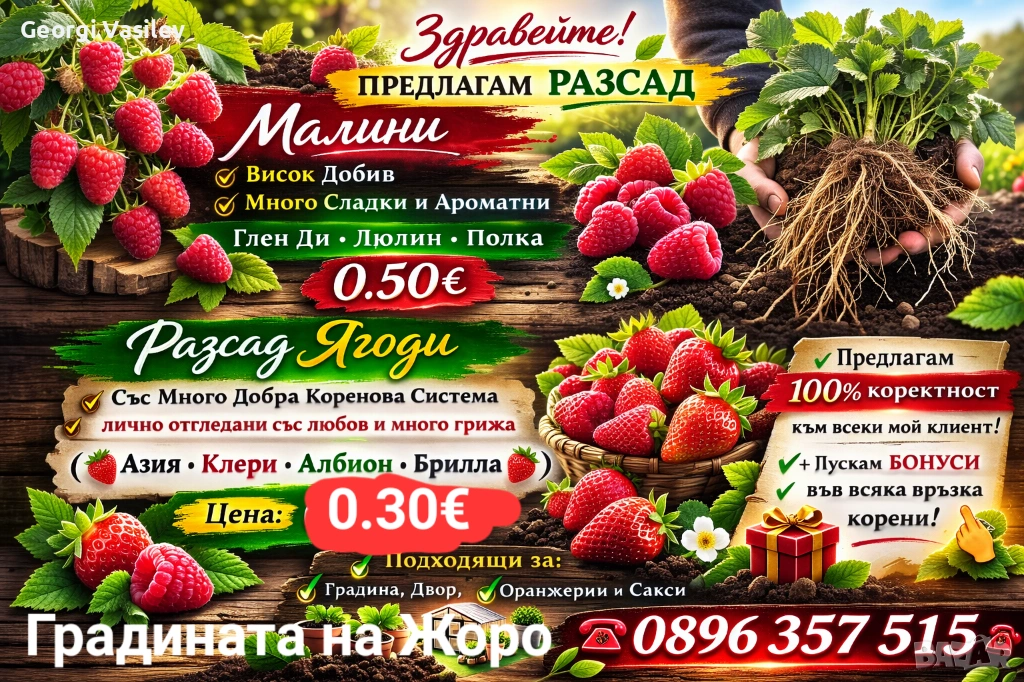 Продавам качествен разсад от ягоди и малини, здрави растения с добре развита коренова система, подходящи за двор, градина и професионално отглеждане.