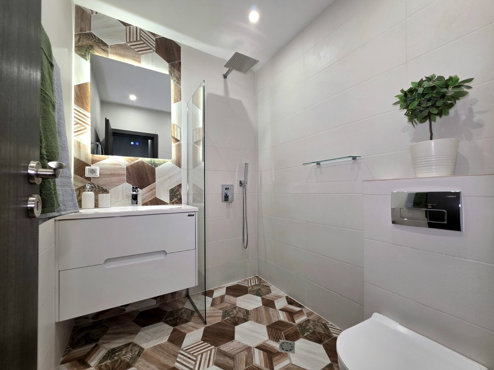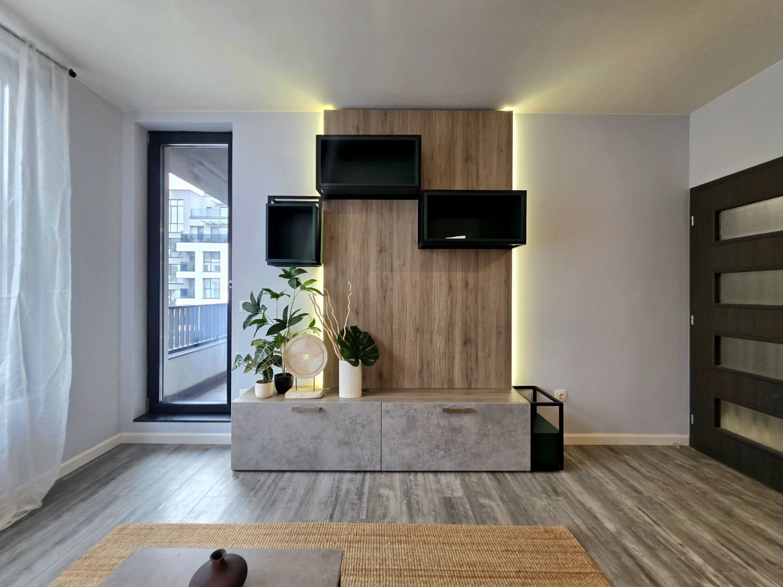 Двустаен, луксозен апартамент до МОЛ Парадайс. Състои се от хол с кухненски бокс, спалня, антре, баня с тоалетна и тераса.