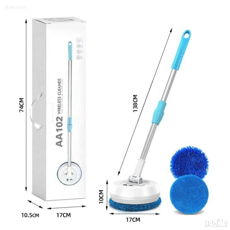 Безжична електрическа четка с въртяща се глава за лесно почистване на подове, прозорци, плочки и тавани. Разполага с телескопична дръжка до 138 см, 2 почистващи приставки и акумулаторна батерия, която работи до около 90 минути с едно зареждане. �