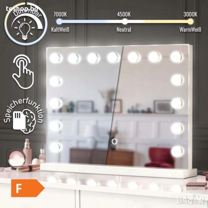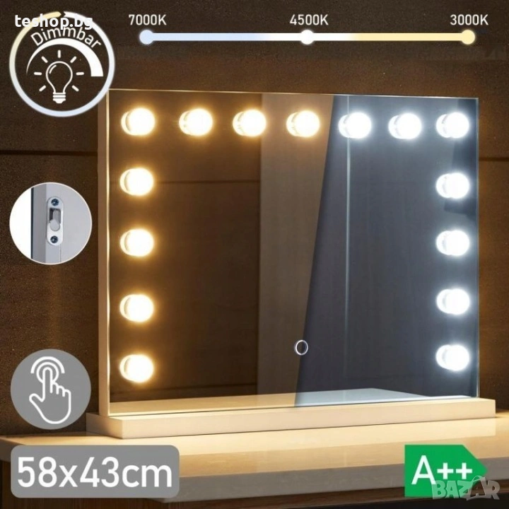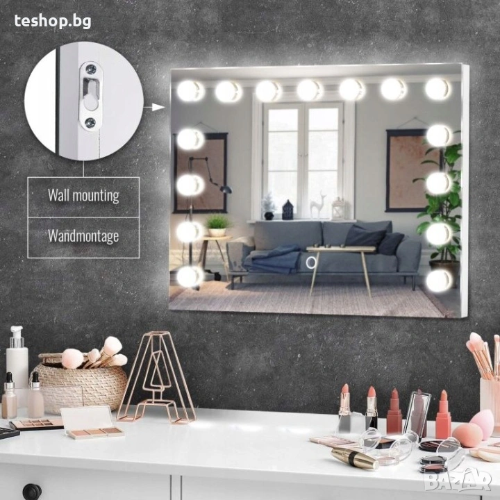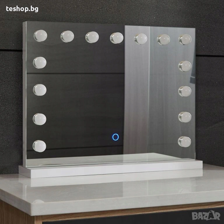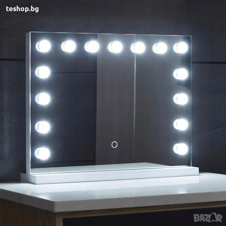 Нашето огледало в холивудски стил със сигурност ще ви зареди с добро настроение и ще оживи атмосферата с всяка прическа и грим. Това модерно и практично козметично огледало ще направи ежедневната ви рутина за красота по-приятна, независимо дали решите да го монтирате на стената или просто да го поставите на тоалетката си. Единственият недостатък е, че ще искате да прекарвате още повече време пред него.