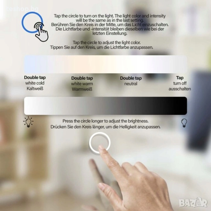 Важни характеристики: сензорен превключвател, функция за затъмняване