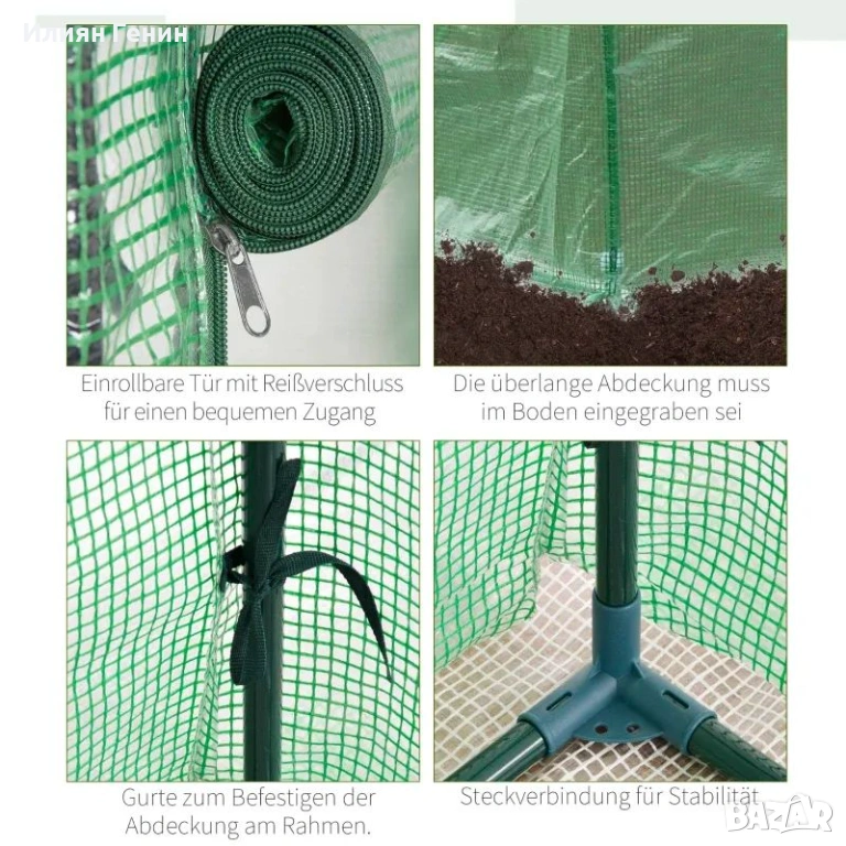 Пластмасов капак: Напълно затвореният, водоустойчив и устойчив на UV лъчи пластмасов капак задържа влажността за отглеждане на тропически растения, като същевременно позволява на богатата на енергия слънчева светлина да преминава. Краищата, удължени с 9 см, са заровени дълбоко в почвата, за да стабилизират и стегнат капака, предотвратявайки задържането на дъждовна вода.