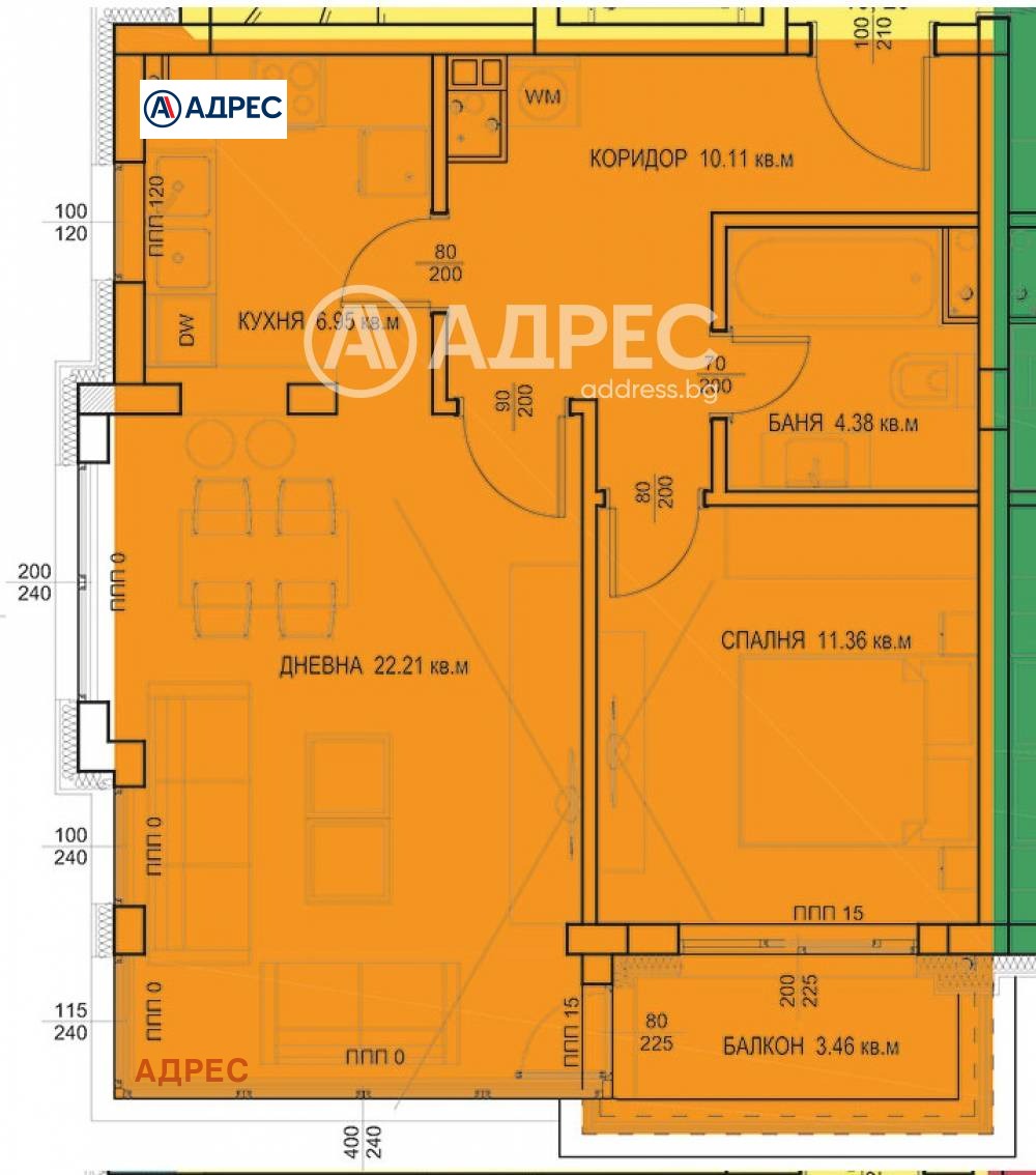Дневен тракт 22 кв, кухня 7 кв, спалня 12 кв, баня и тоалет . Обща тераса. Разположен на втори жилищен етаж в сграда, въведена в експлоатация през 2025 година,