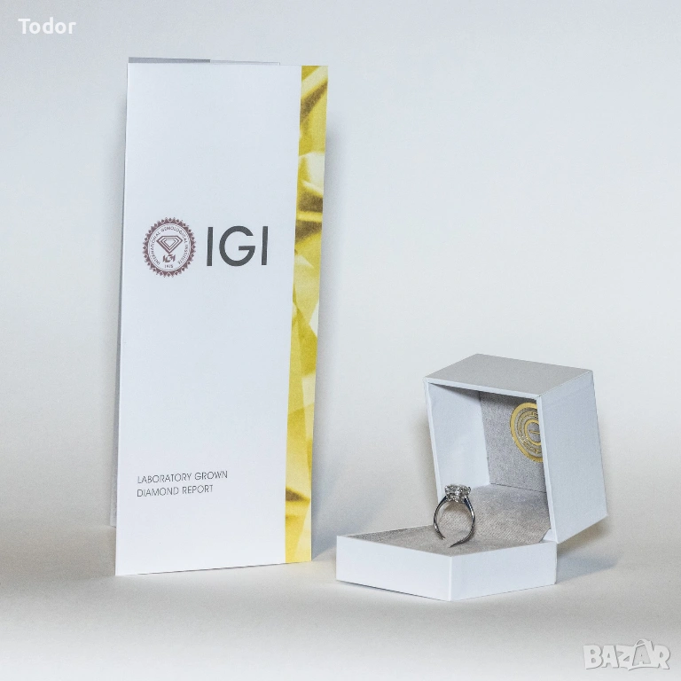 Диамантния пръстен е с много високо качество и се предлага с оригинален сертификат от International Gemological Institute (IGI) лаборатория, което гарантира неговата 100% автентичност.