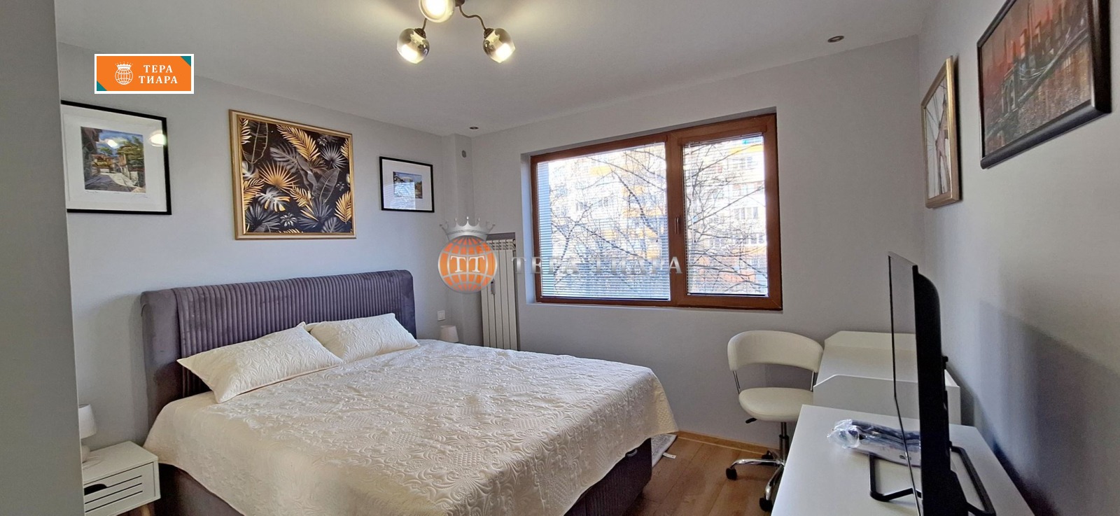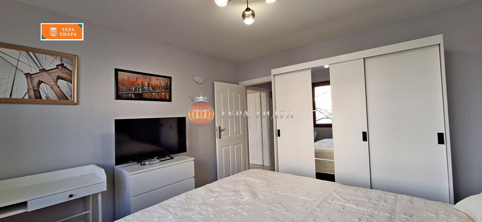 Апартаментът е напълно обзаведен с много вкус и внимание към детайлите, с нови качествени мебели и оборудване. На разположение на бъдещите наематели, освен това което се вижда на снимките, има абсолютно всичко необходимо за комфортен живот много над средното равнище ( разбира се всичко е ново), като започнем с пълното оборудване на кухнята вкл. ножове, вилици, чаши, чинии, тенджери, тигани, тави и т.н., минем през завивки, възглавници, чаршафи и т.н. и стигнем до ютия, прахосмукачка, сушилка и т.н., та дори салфетки и тоалетна хартия. Бъдещите наематели трябва само да се събуят и влязат.