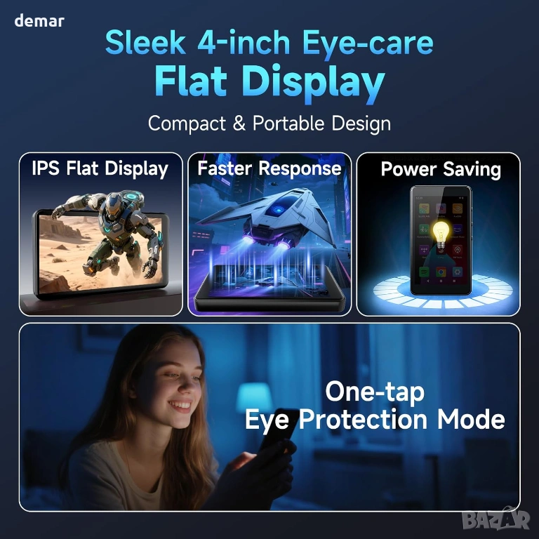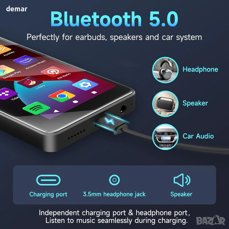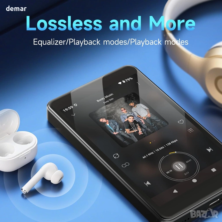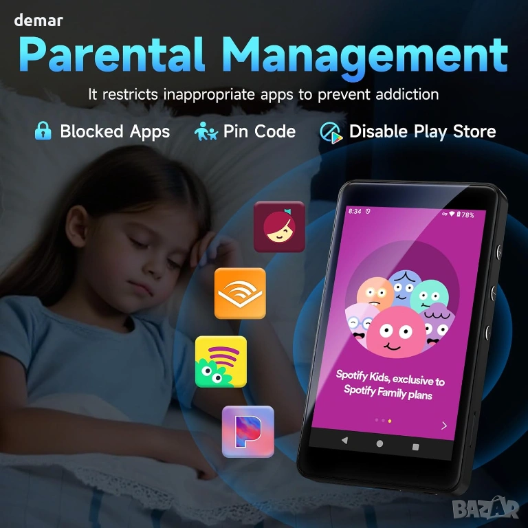 Захранван от Android 14 с осемядрен процесор, този MP3 плейър поддържа стрийминг приложения като Spotify, Pandora, TIDAL, Amazon Music, Libby и Audible през Play Store, като същевременно позволява премахването на нежелани приложения. Той разполага с родителски контрол с ограничения за приложения и защита с парола, 4-инчов IPS сензорен екран с грижа за очите с нощно осветление и тъмен режим и интелигентна функция за пестене на енергия за удължаване на живота на батерията. Паметта включва 3GB RAM, 32GB вътрешна памет плюс 64GB карта (разширяема до 1TB). Двубандовият Wi-Fi и Bluetooth 5.0 позволяват стабилно стрийминг и лесно сдвояване със слушалки, високоговорители или автомобилни системи. Устройството предлага също запис на глас, опции за слушане на FM радио, широка поддръжка на аудио формати, издръжлив дизайн от закалено стъкло с метални ръбове и се предлага със слушалки, силиконов калъф, USB кабел и карта памет.