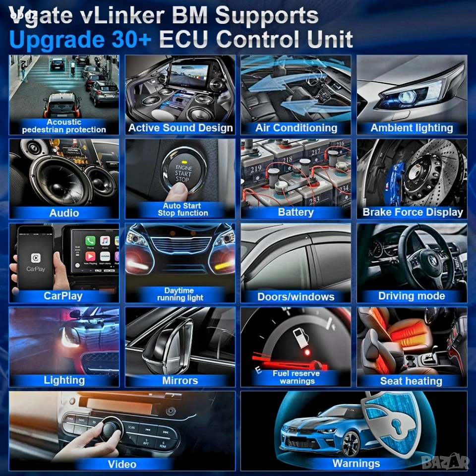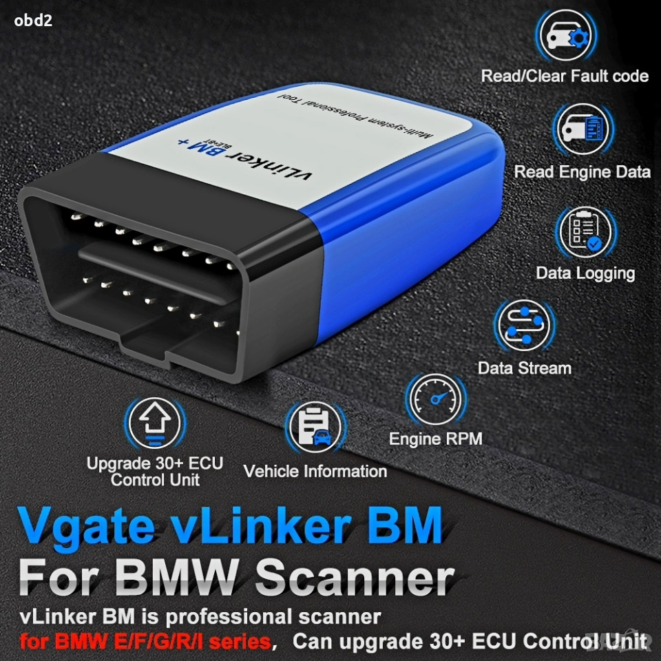Професионална автодиагностика Vgate vLinker BM+ (BLE+BT) - Идеален за BimmerCode / OBD2 Bисококачествен професионален OBD2 диагностичен скенер Vgate vLinker BM+. Това е мултисистемен инструмент от ново поколение, който е значително по-бърз, по-стабилен и с повече възможности от масовите ELM327 устройства на пазара. Моделът BM+ (Bluetooth + BLE) е специално проектиран да работи безупречно както с Android, така и с iOS (iPhone/iPad) и Windows устройства. Особено препоръчителен е за собственици на BMW и Mini, тъй като е официално препоръчан хардуер за работа с най-популярните приложения като BimmerCode (за кодиране и отключване на екстри) и BimmerLink (за диагностика на дилърско ниво). Разбира се, работи отлично и с всички останали марки автомобили, съвместими с OBD2 стандарта. 🌟 Основни предимства: Двойна свързаност (BLE + BT): Гарантира бърза и стабилна връзка без прекъсвания за всички операционни системи (iOS, Android, Windows). Многократно по-бърз от ELM327: Позволява плавно четене на данни в реално време (Live Data) без забиване. Battery Saver технология: Може да остане включен в буксата на автомобила постоянно. Устройството "заспива" автоматично, когато не се ползва, и не изтощава акумулатора. Защита от хакери: Сигурна връзка, която предотвратява неоторизиран достъп. 📱 Съвместим с най-добрите приложения: BimmerCode / BimmerLink (Пълна поддръжка за BMW/Mini) Torque Pro / Lite Car Scanner ELM OBD2 OBD Auto Doctor FORScan (за Ford/Mazda) JScan и много други... ⚙️ Поддържани протоколи (според спецификацията): Стандартни OBD2 протоколи: SAE J1850 PWM SAE J1850 VPW ISO 9141-2 ISO 14230-4 (slow) ISO 14230-4 (fast) ISO 15765-4 (CAN) Разширени протоколи: SAE J1939 (CAN) ISO 11898 (raw can) Състояние: Чисто ново, в оригинална опаковка.